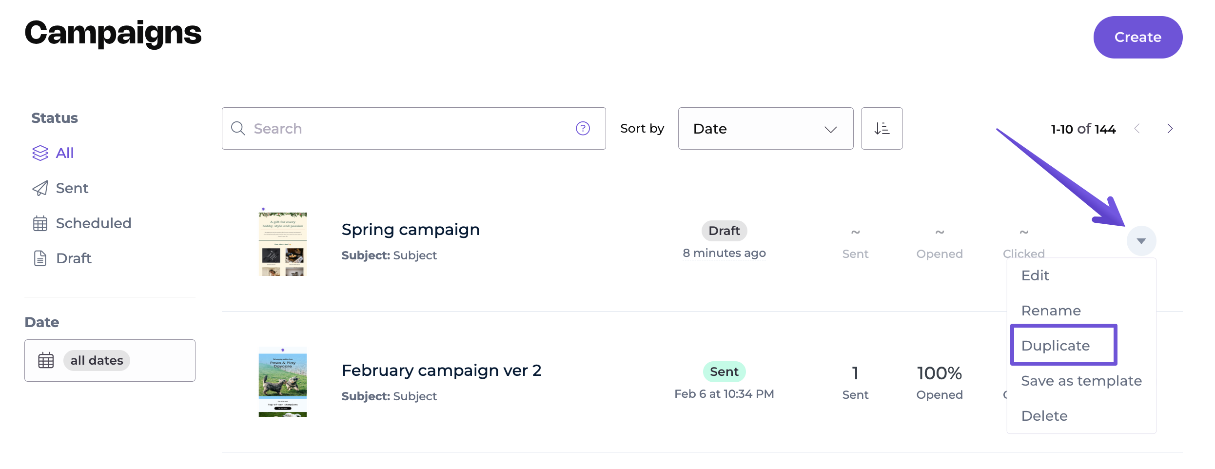 From the Campaigns tab, find the campaign you want to copy, click on the drop-down menu next to your campaign's name and then select Duplicate from the menu.