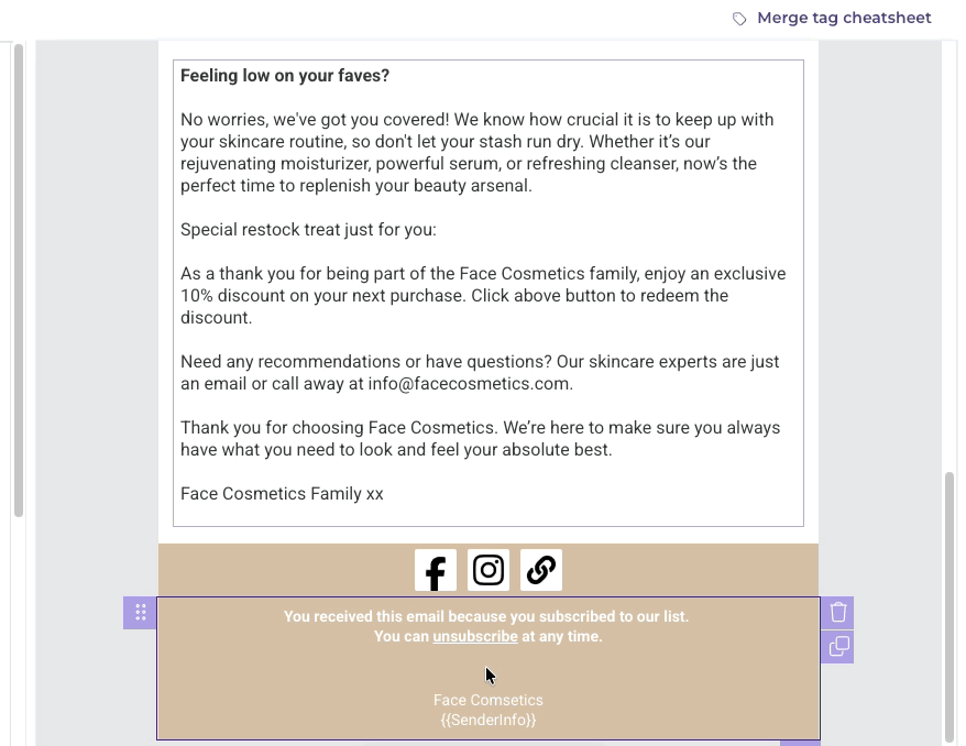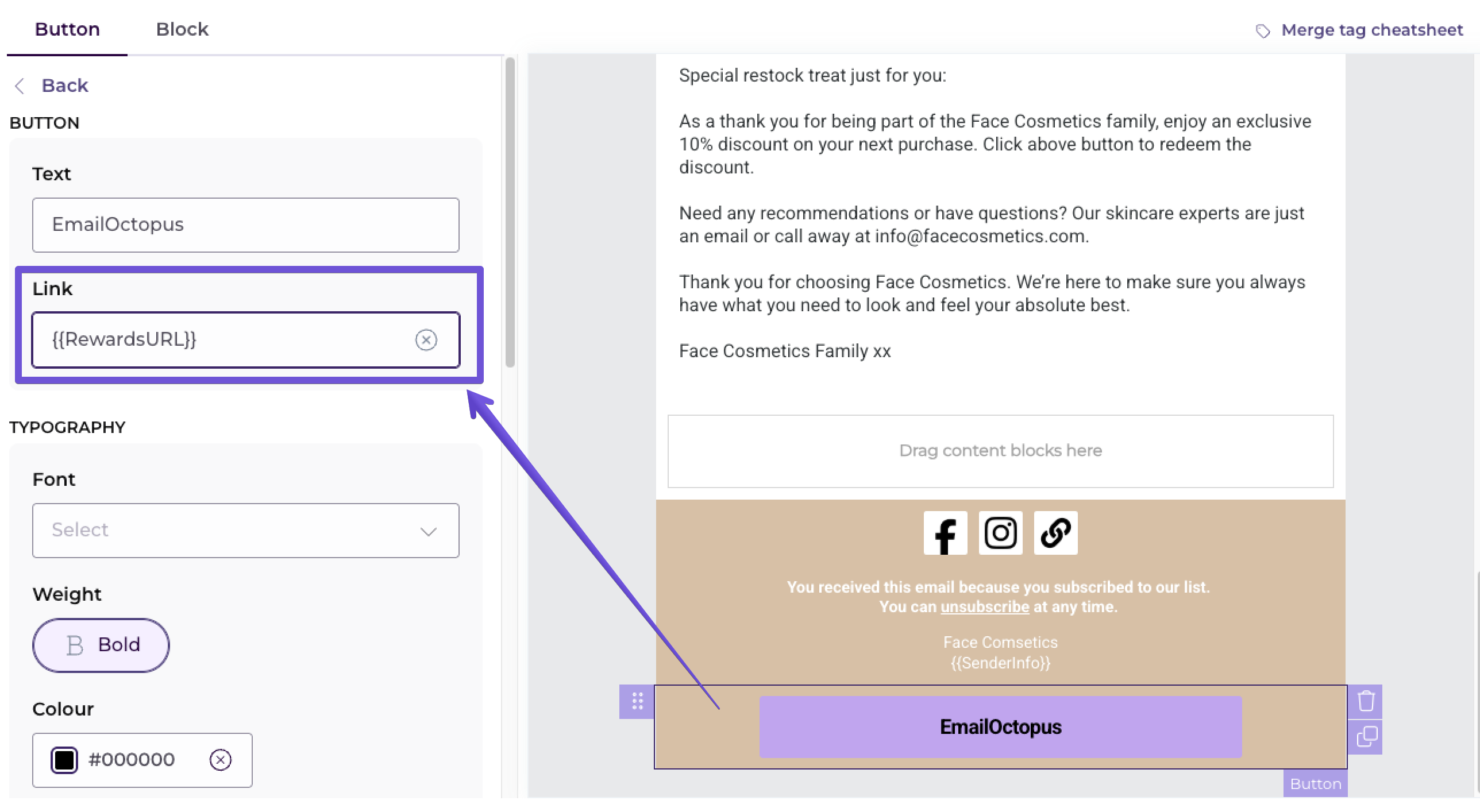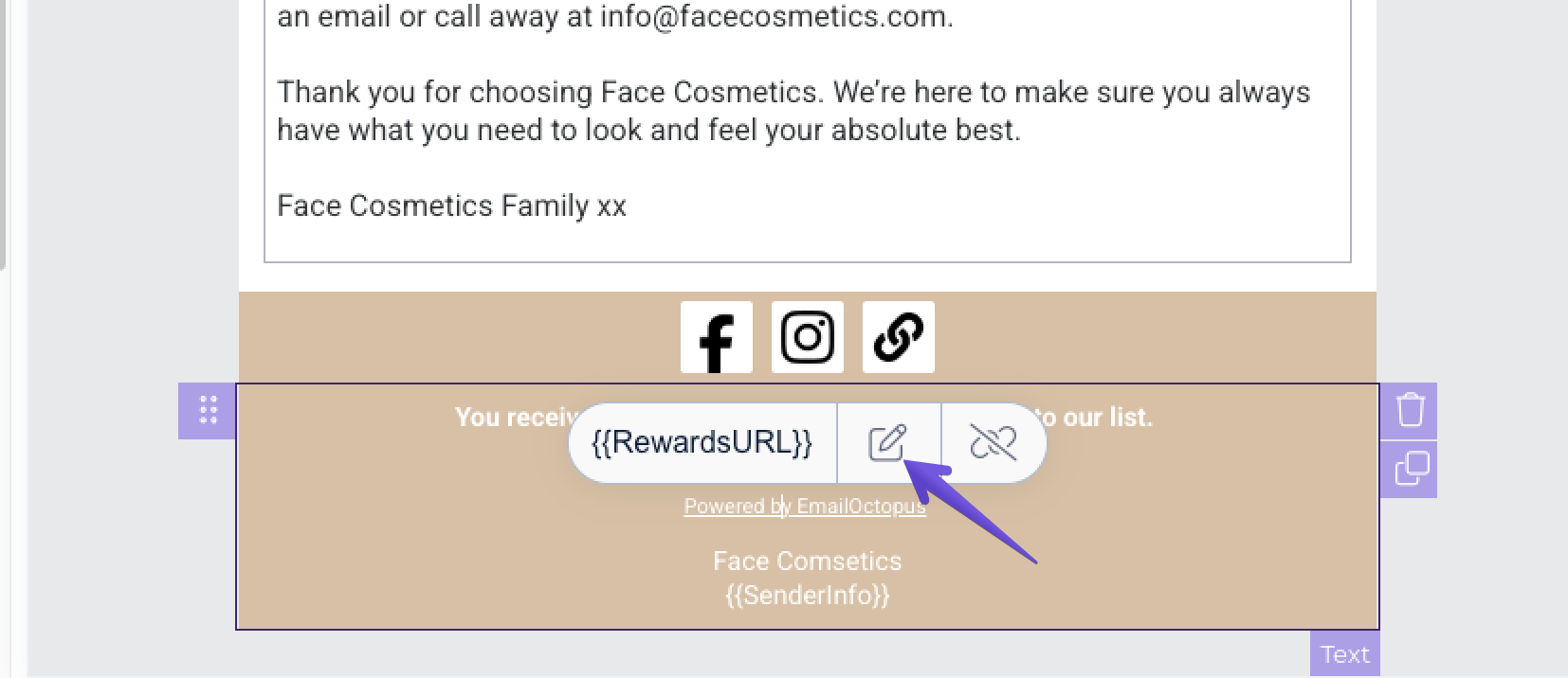 In the Drag and drop editor, you can insert it by selecting RewardsURL from the Merge Tag drop-down menu in the text editor toolbar. To display the toolbar, click the space bar on your keyboard and highlight the empty space. It'll be replaced with the merge tag once you've selected it from the drop-down menu.