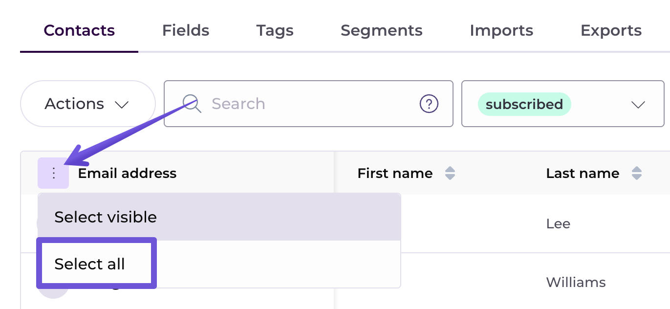 You can adjust filters and export only the contacts who meet certain criteria, such as Status, Segment, and Tags, or even search for specific contacts and export those.