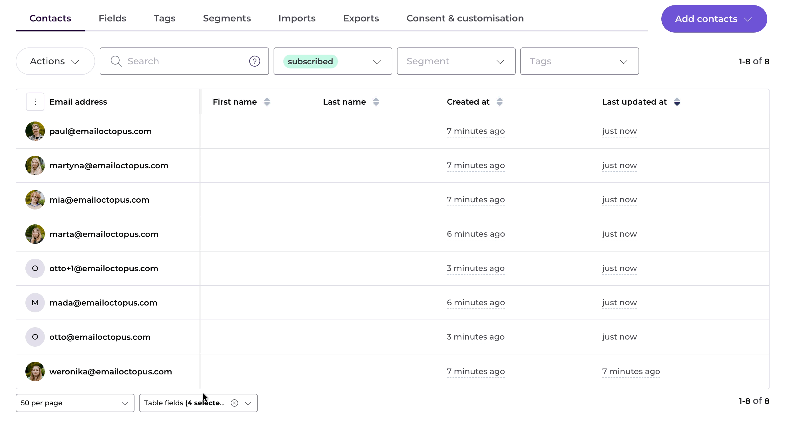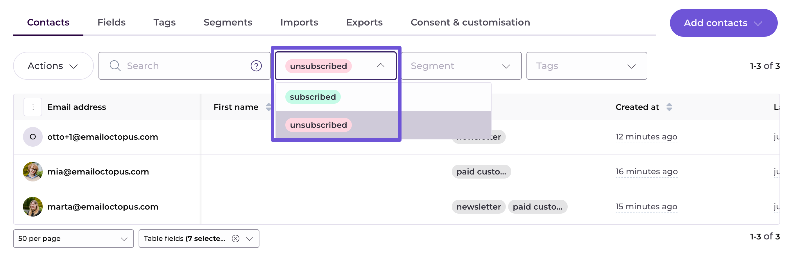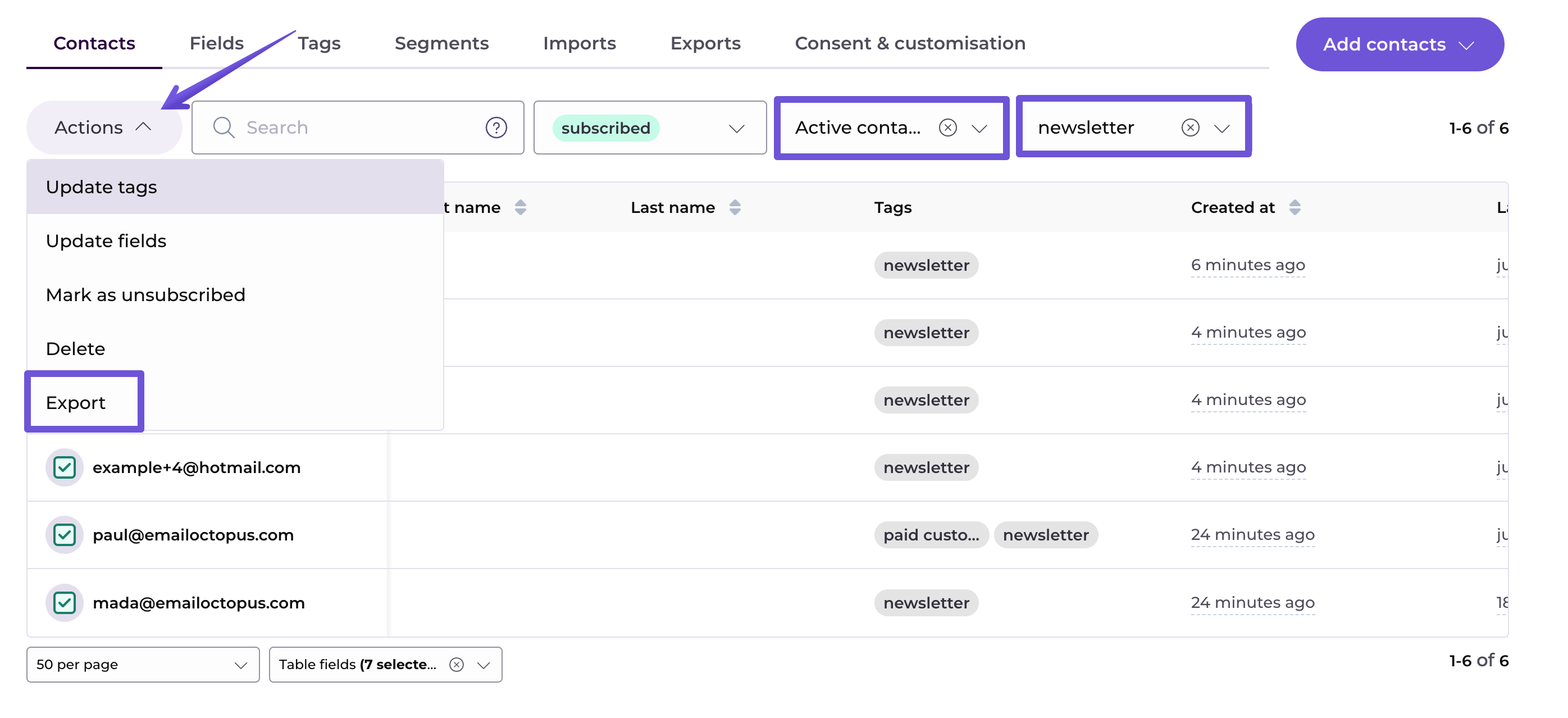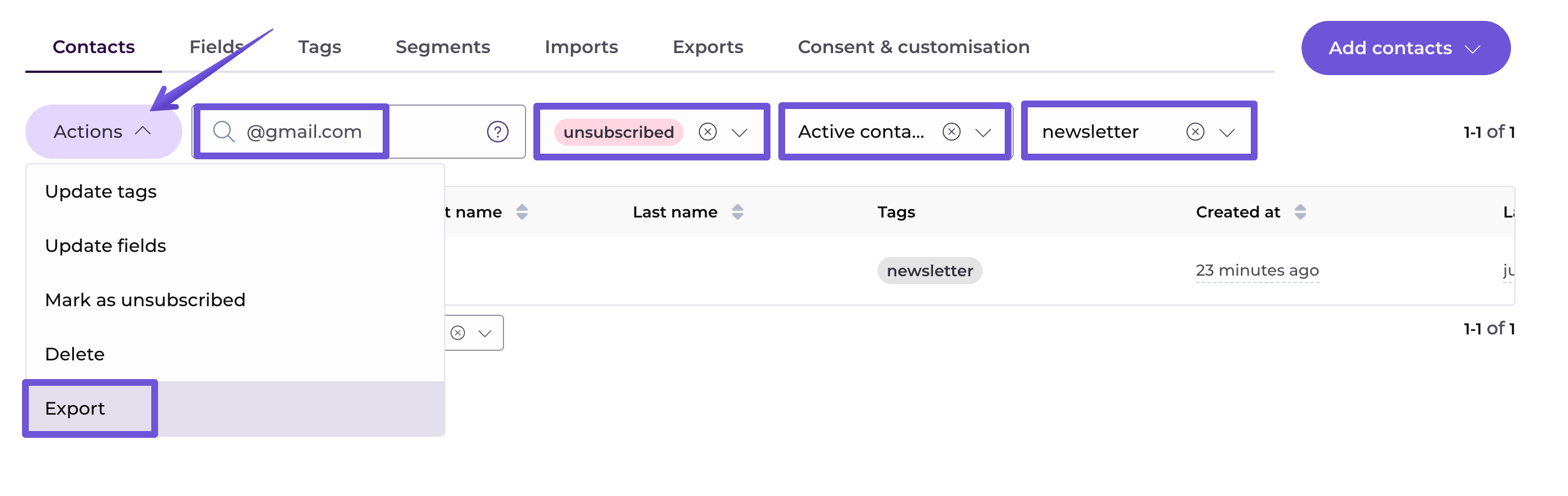 Or even search for specific contacts who are also in a given segment and have a tag assigned. Here, unsubscribed contacts with @gmail.com address who are in the segment "Active contacts" and also have a tag "newsletter" assigned will be shown and can be exported: