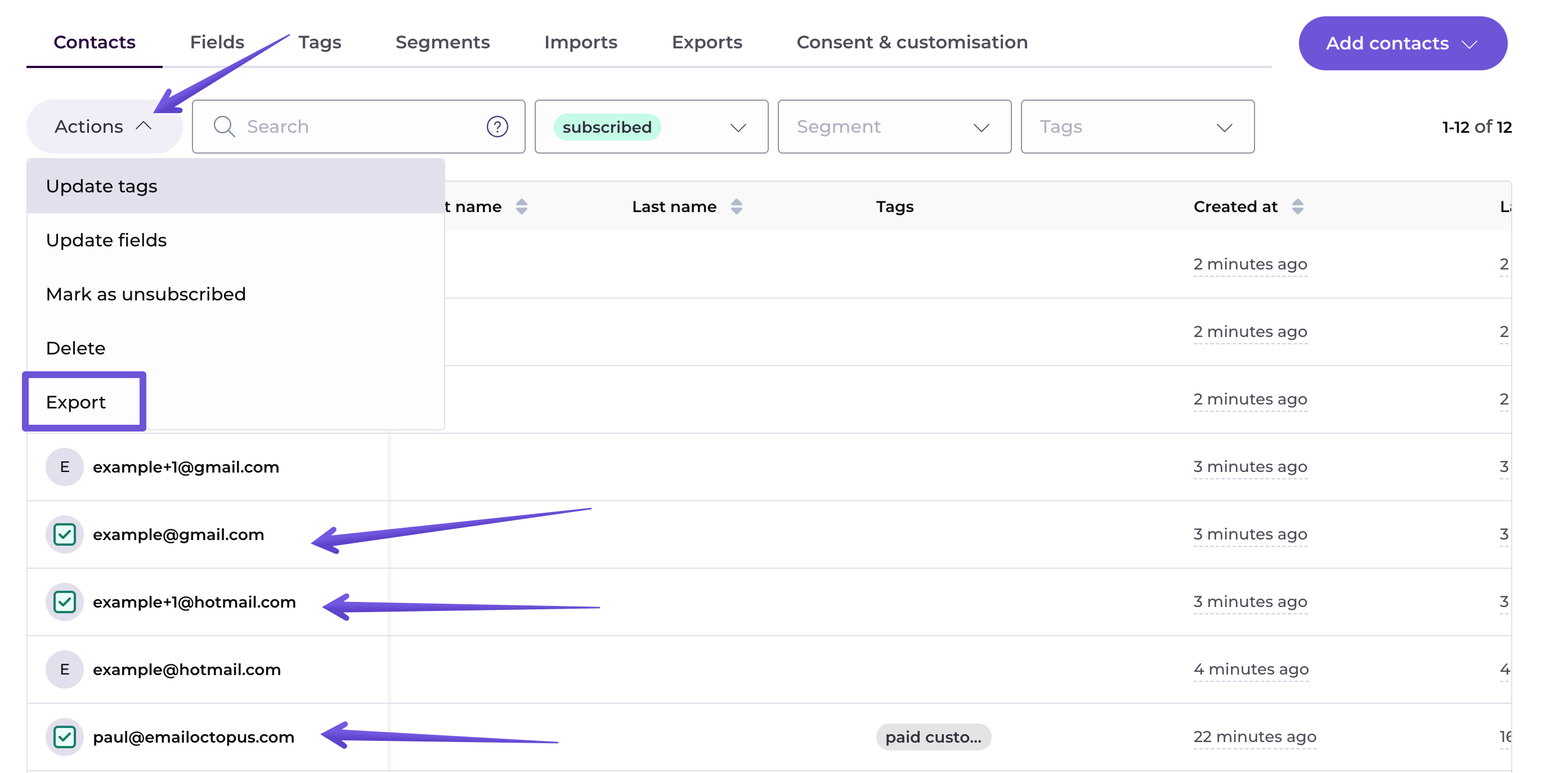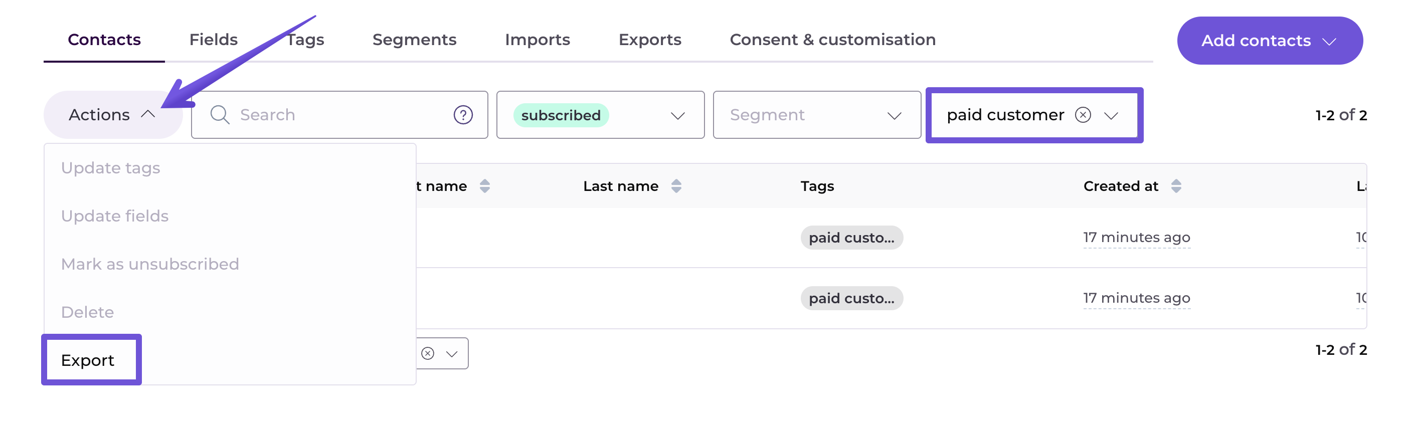 Export contacts with multiple filters: you can combine multiple filters to export your contacts. For example, you can export contacts in a given segment that also have a specific tag assigned: