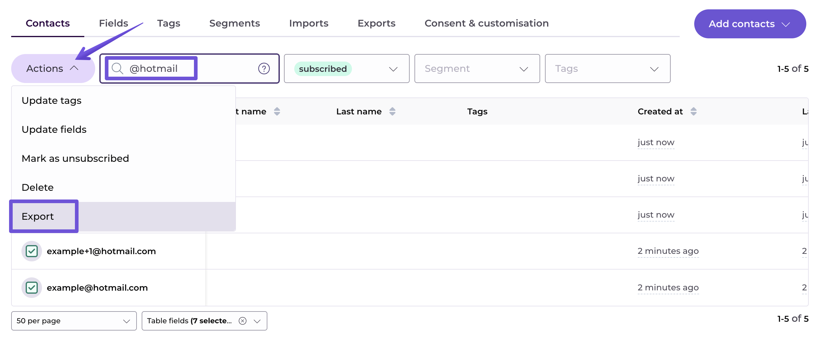 Export contacts from a search: you can also search for specific contacts and export those. Here, all subscribed contacts with @hotmail.com email addresses will be shown and can be exported:
