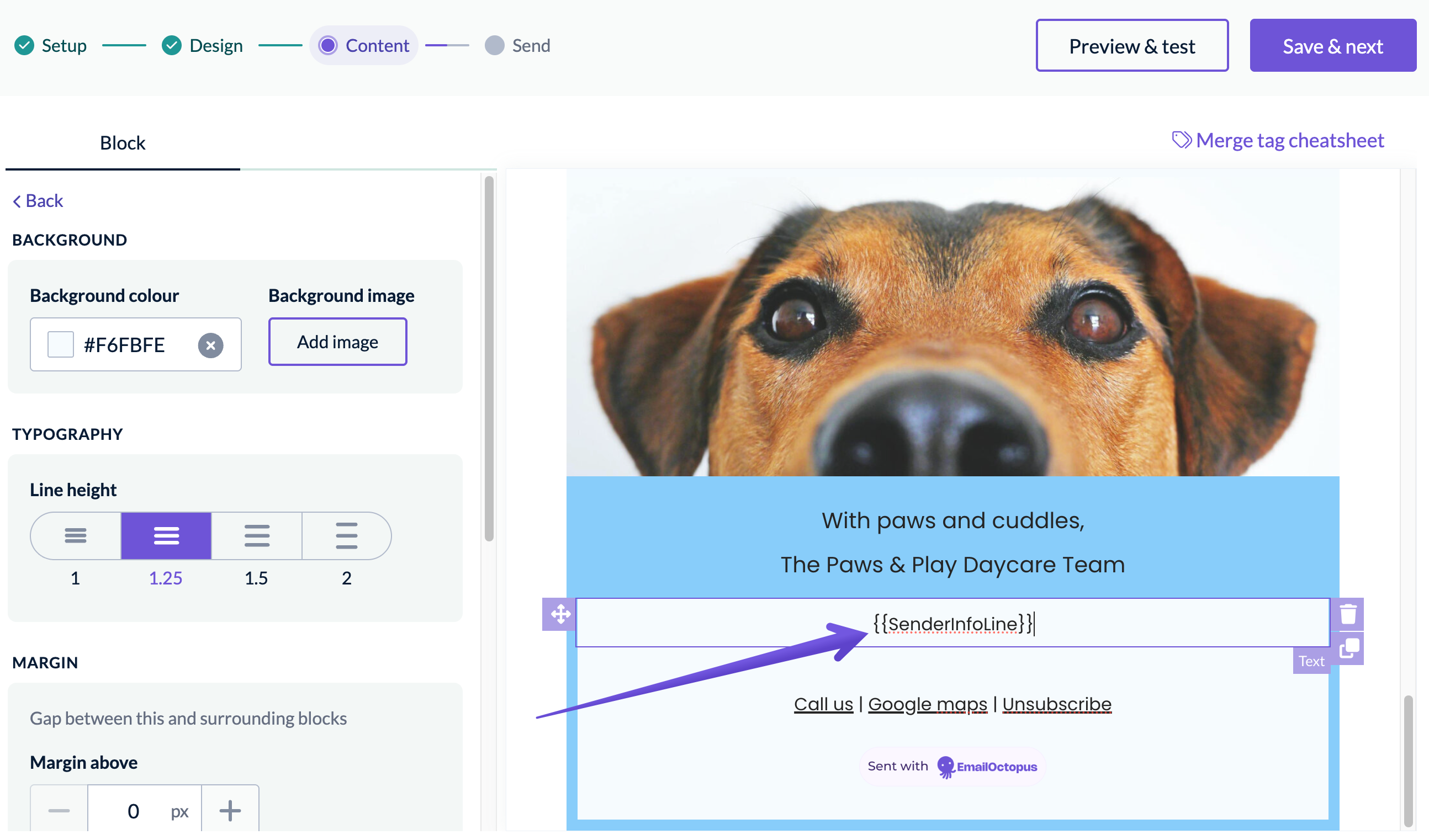 Once you've set your mailing address in EmailOctopus, you can output it using the {{SenderInfo}} merge tag at the bottom of your campaigns and templates, saving you the need to write out your address every time. If you'd like the address to appear on a single line, use {{SenderInfoLine}}.