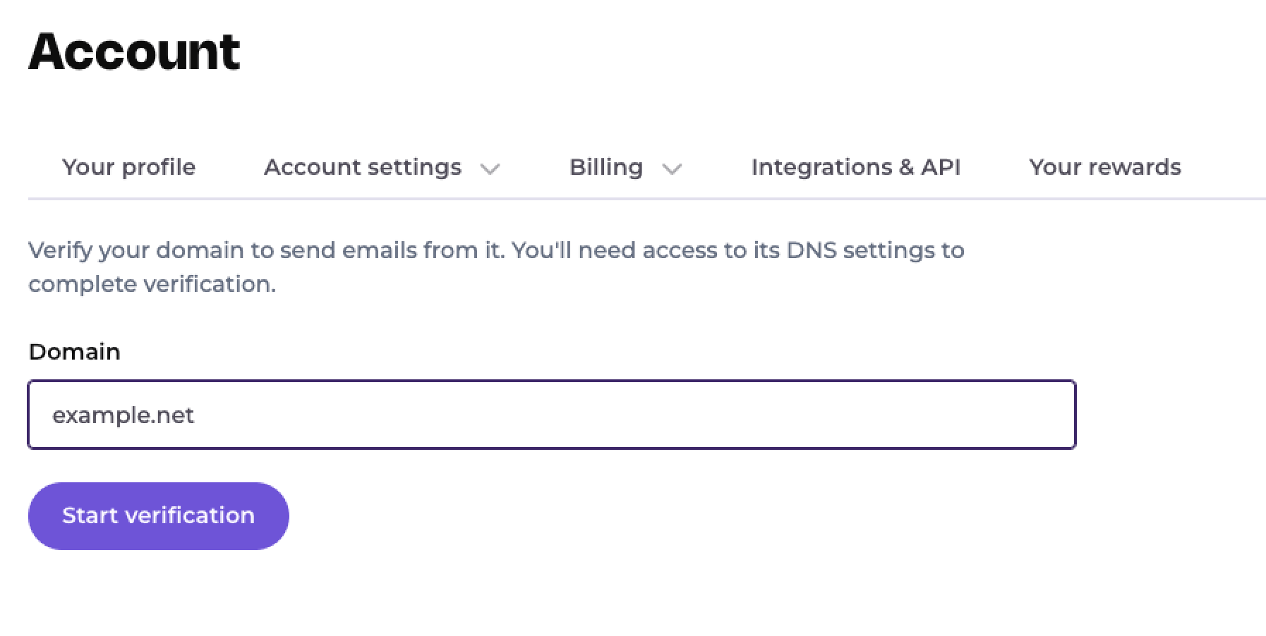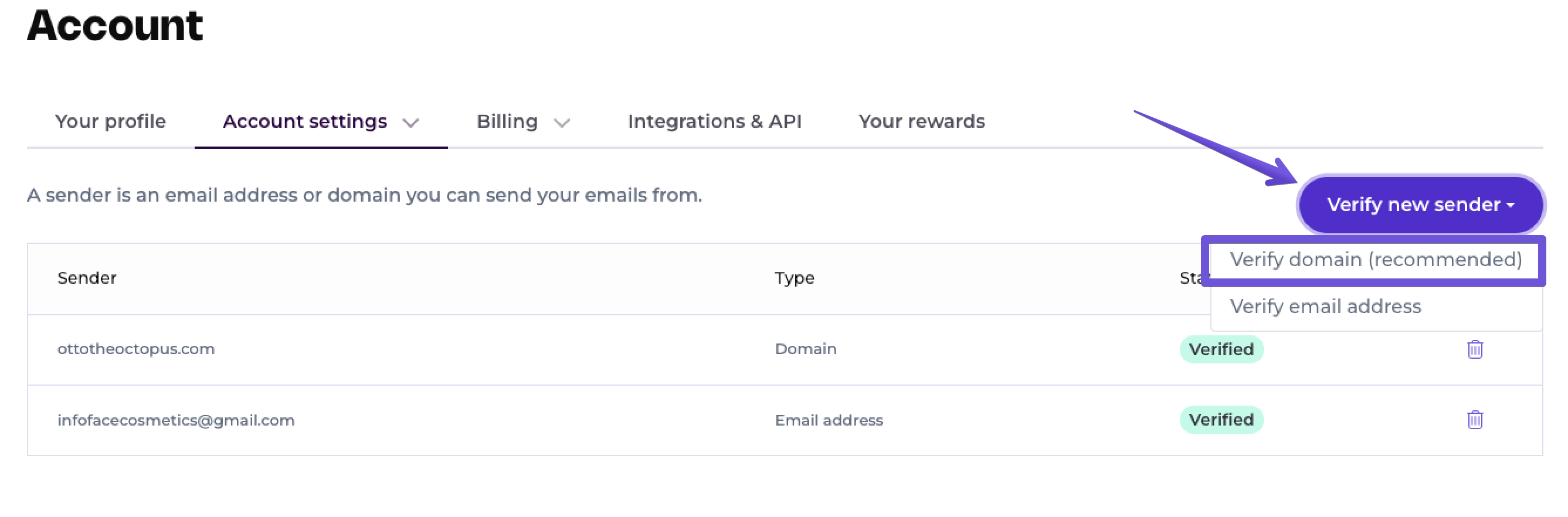 To begin the process, visit the Senders screen. Click Verify new sender, then Verify domain (recommended).