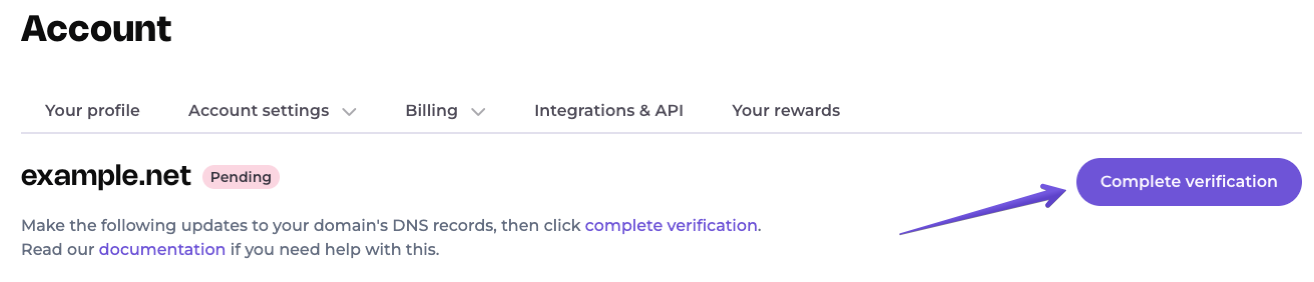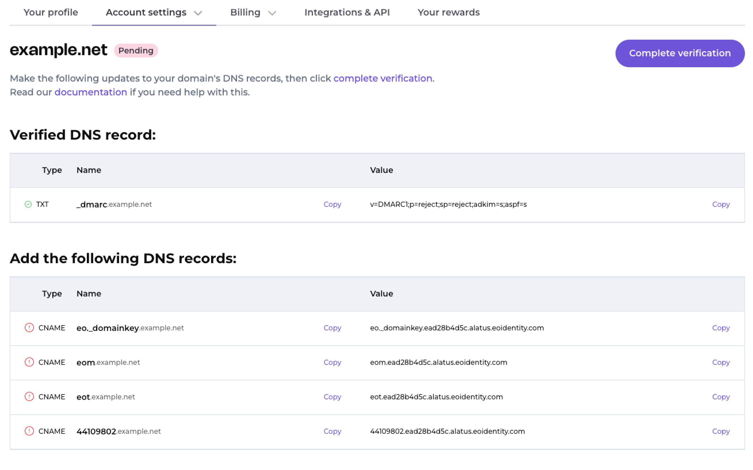 Note: Not all domain providers' DNS set-ups will be the same. If you receive a Failed status upon clicking Complete verification, try creating the CNAME records with just the subdomain in your new DNS settings. Example: Remove ".yourdomain.com" from all CNAME records when you copy and paste them to your domain provider's DNS settings, so "eom.yourdomain.com" becomes just "eom".