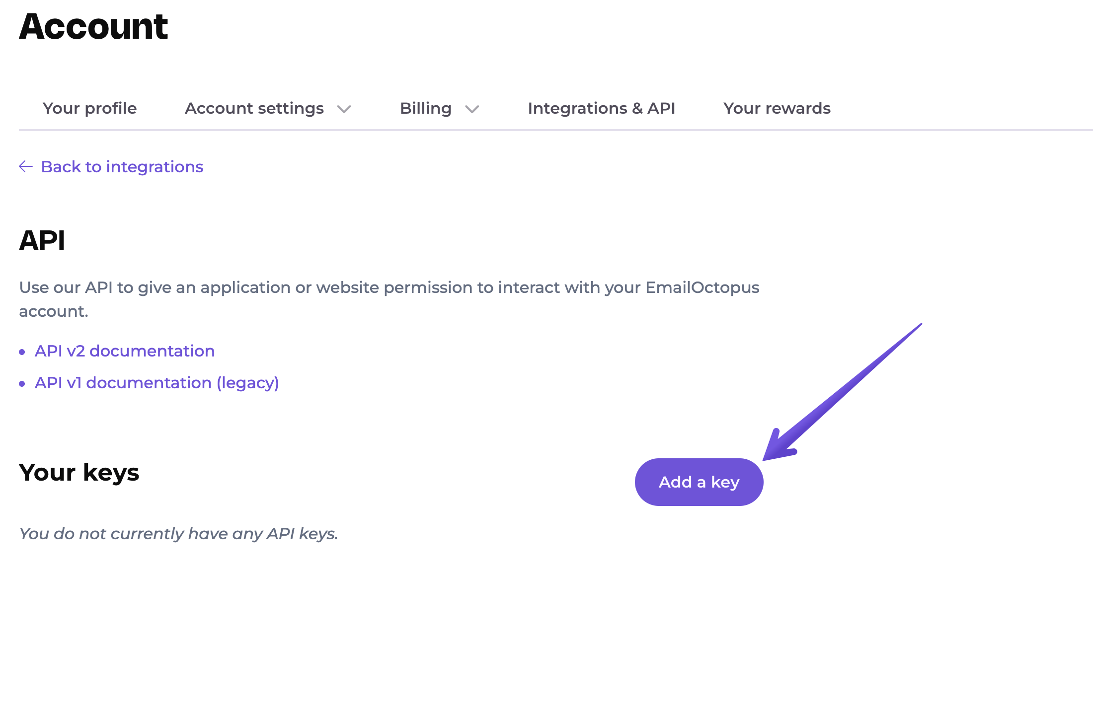 6. Log in to your EmailOctopus dashboard and follow this link to the API screen. If you haven’t created an API key yet, click Add a key.