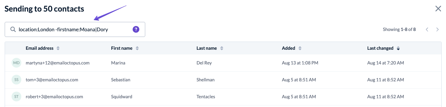 added: | Search for contacts added on a specific date using the YYYY-MM-DD format | added:2019-08-01 |
