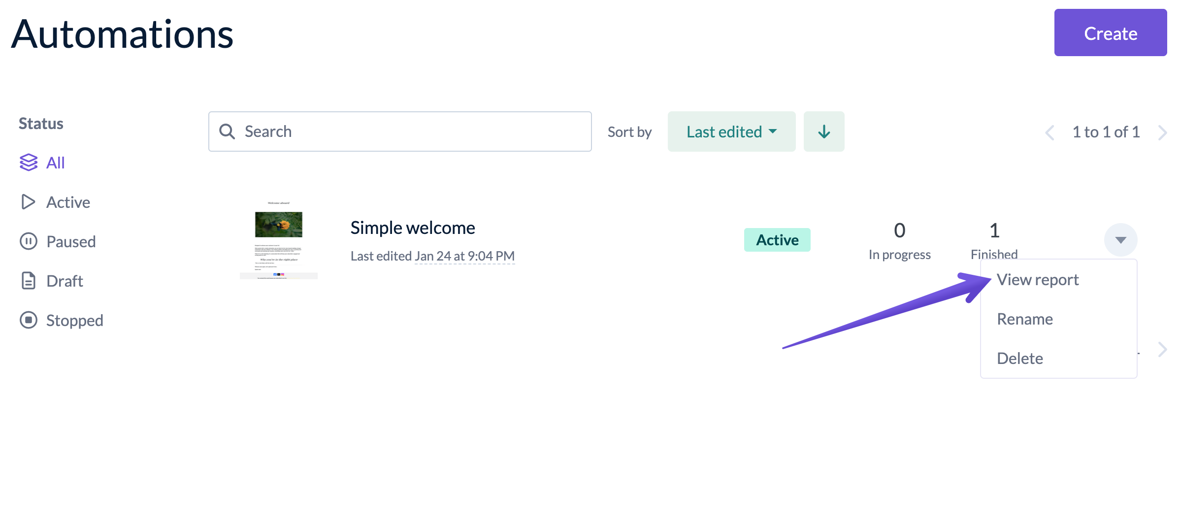 To access the online version of your automated email, go to the Automations tab, open the report, and in the dropdown menu of a selected email, choose the View report option.