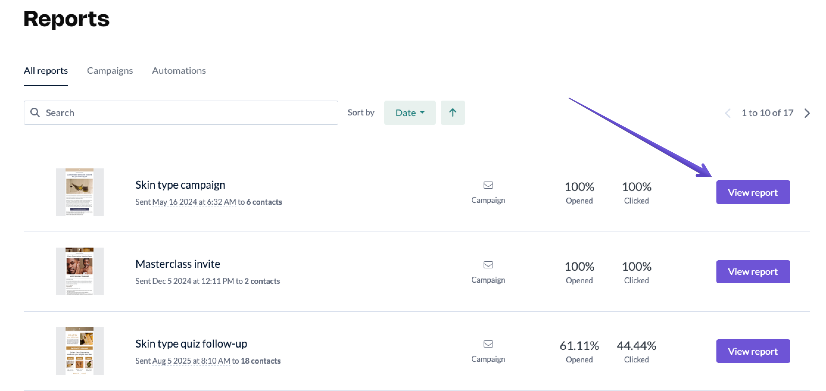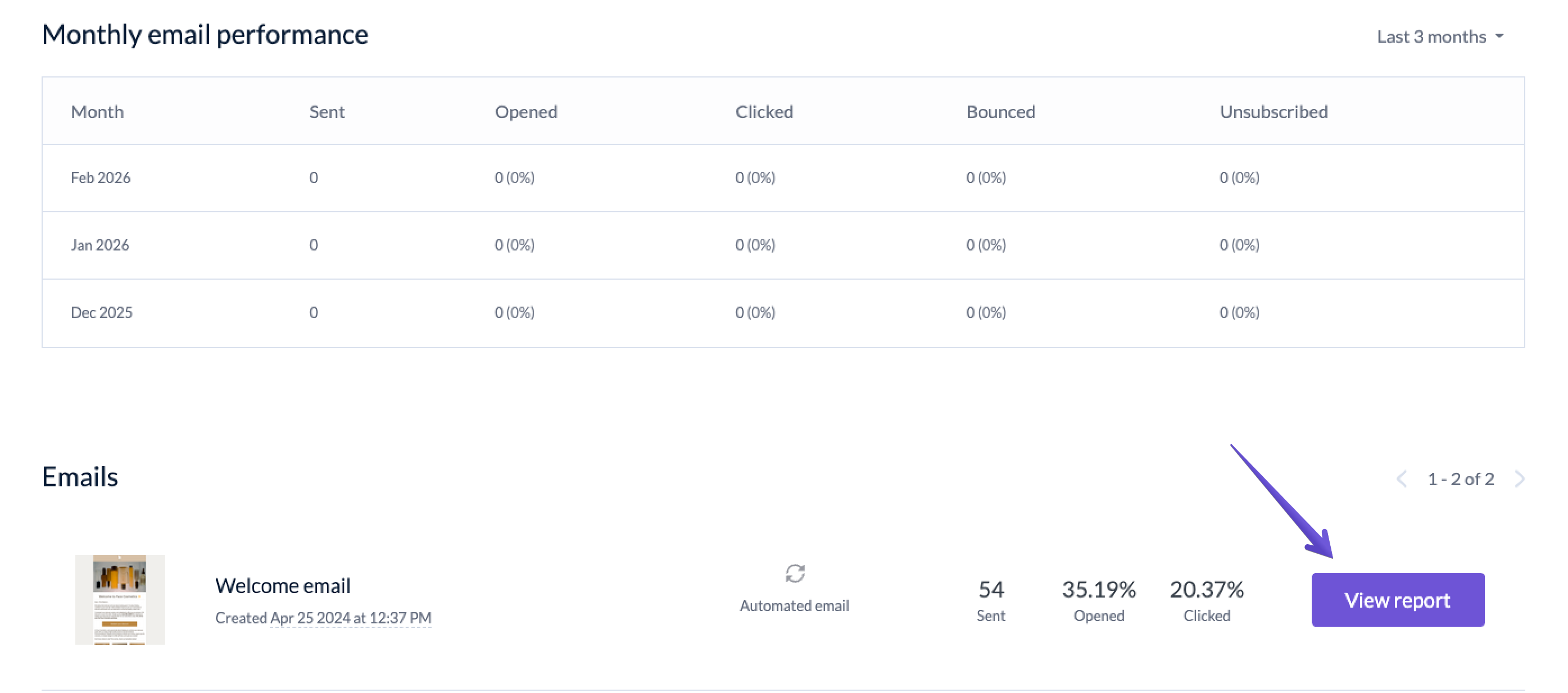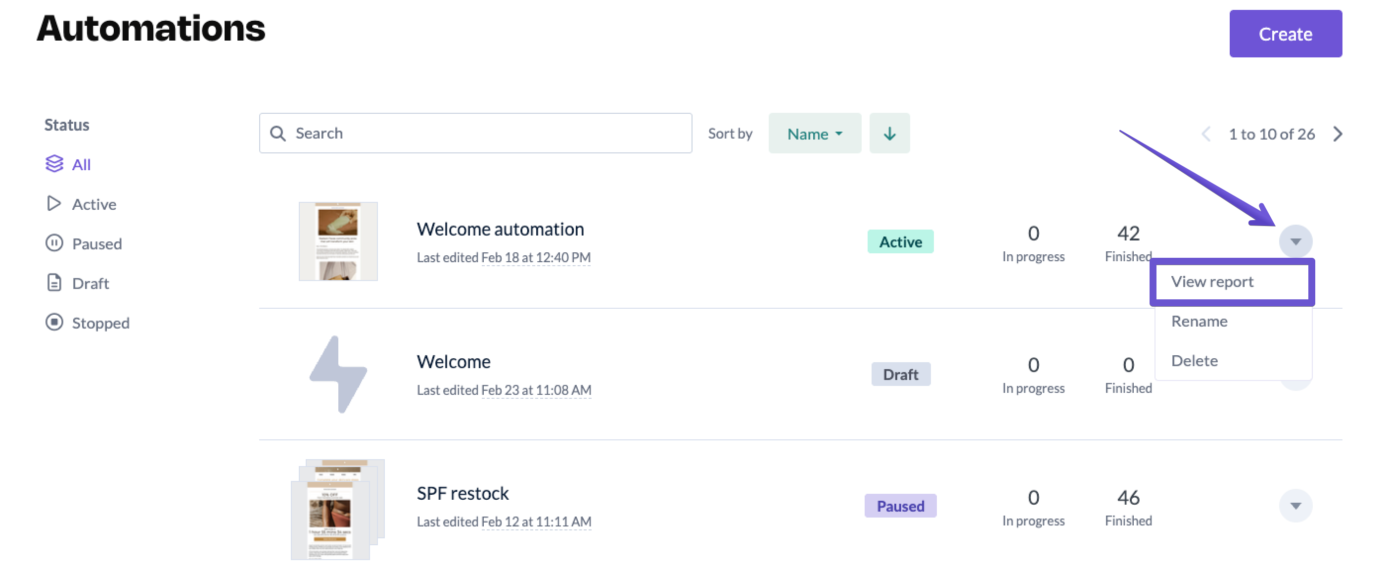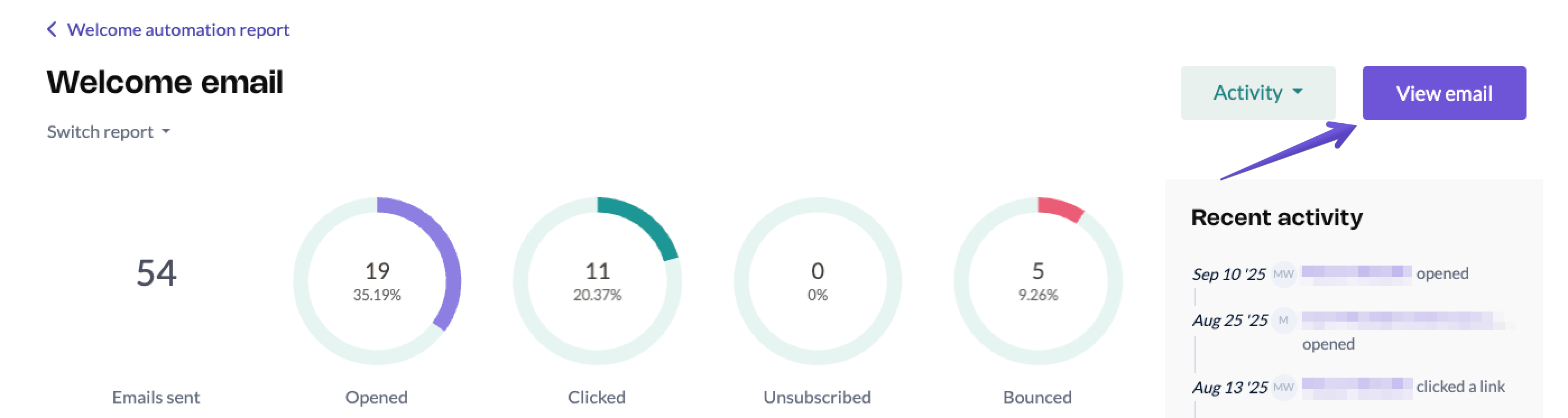 To access the online version of your automated email, go to the Automations tab, open the report, and choose the View report option.