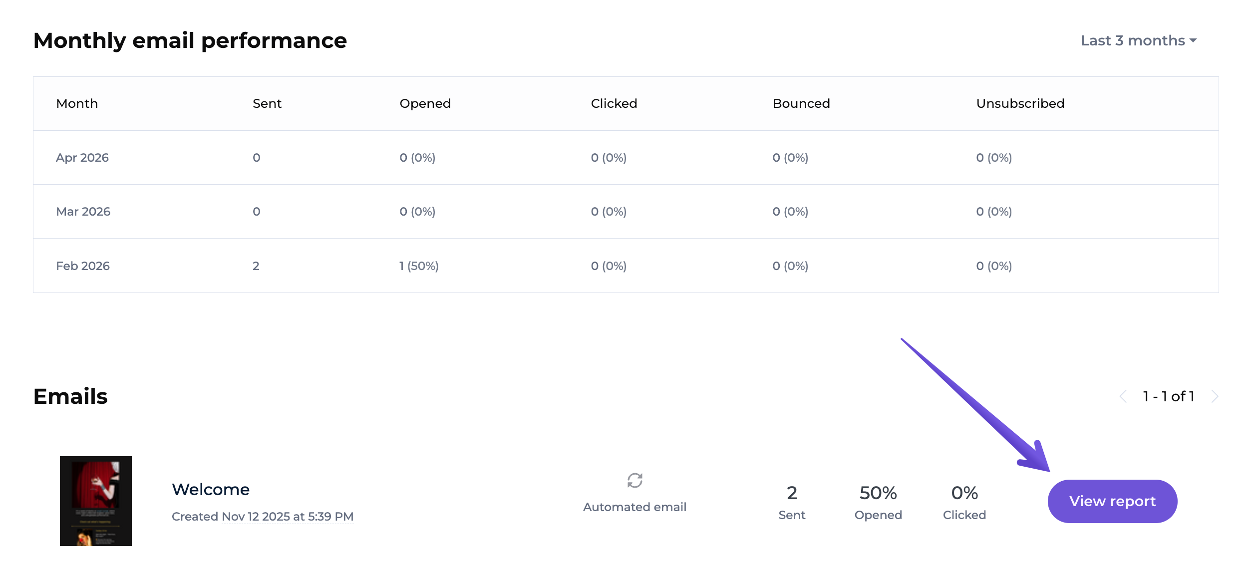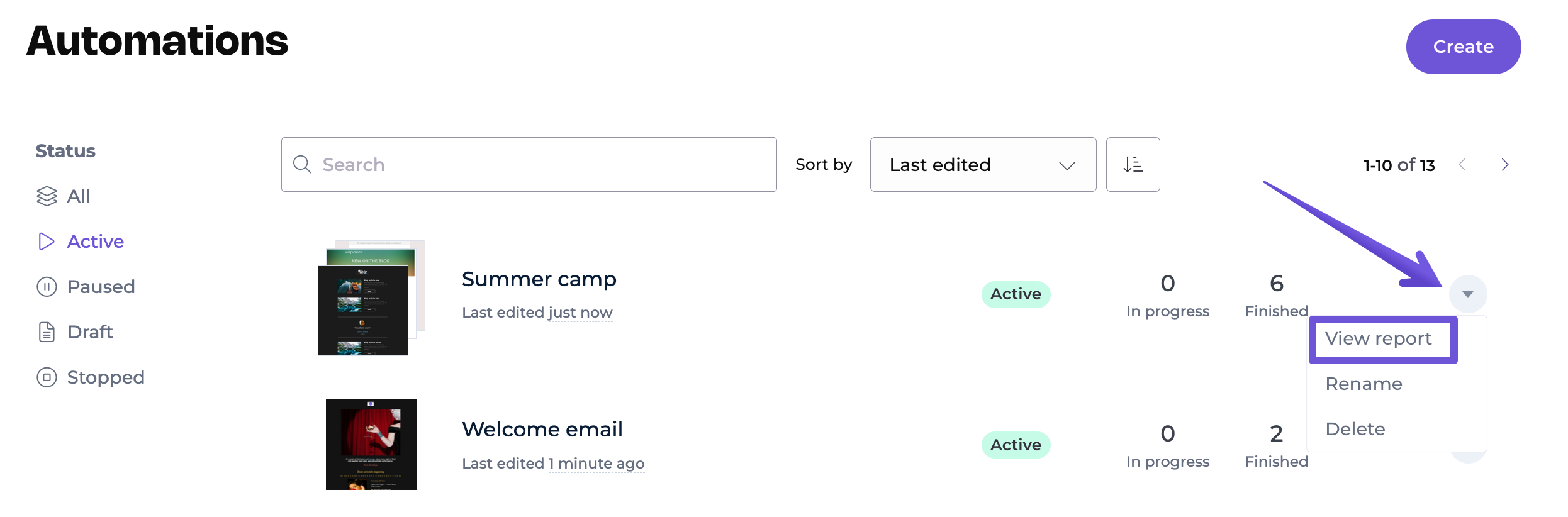 To access the online version of your automated email, go to the Automations tab, open the report, and choose the View report option next to the automated email.