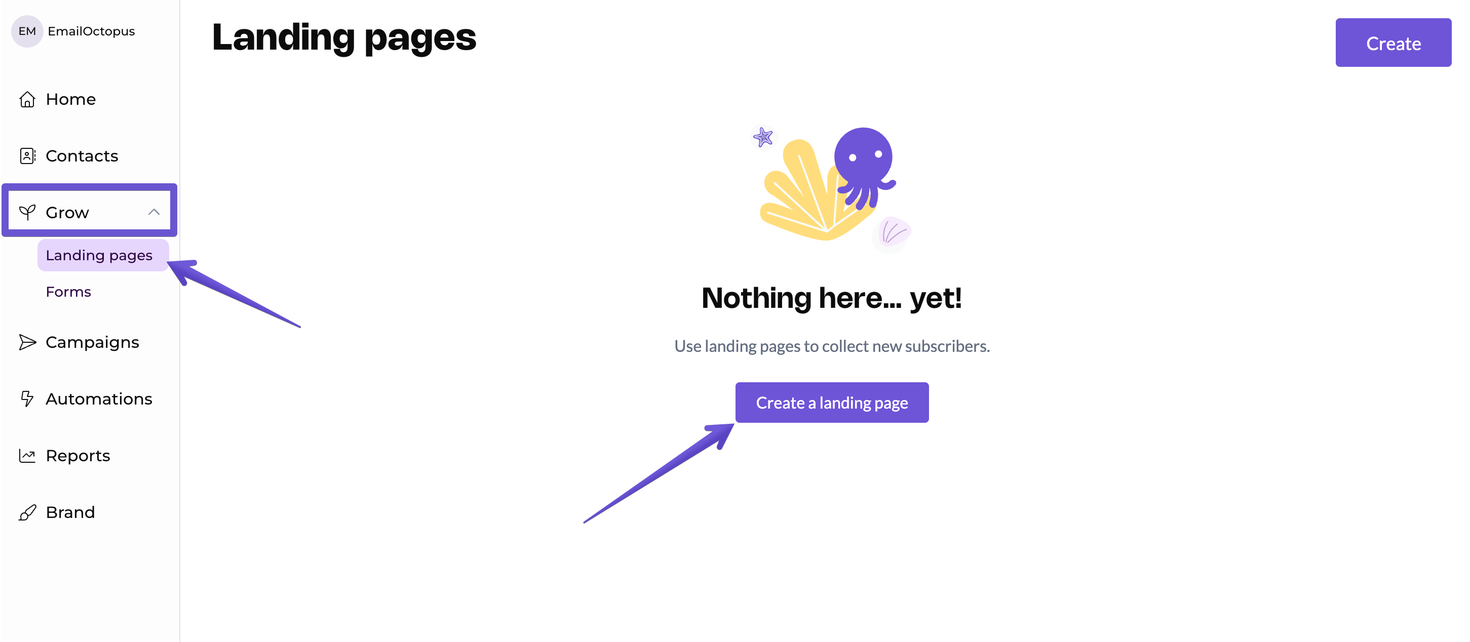 To create one, click on the Grow tab from the sidebar and select Landing pages. From there, you can click Create or Create a landing page.
