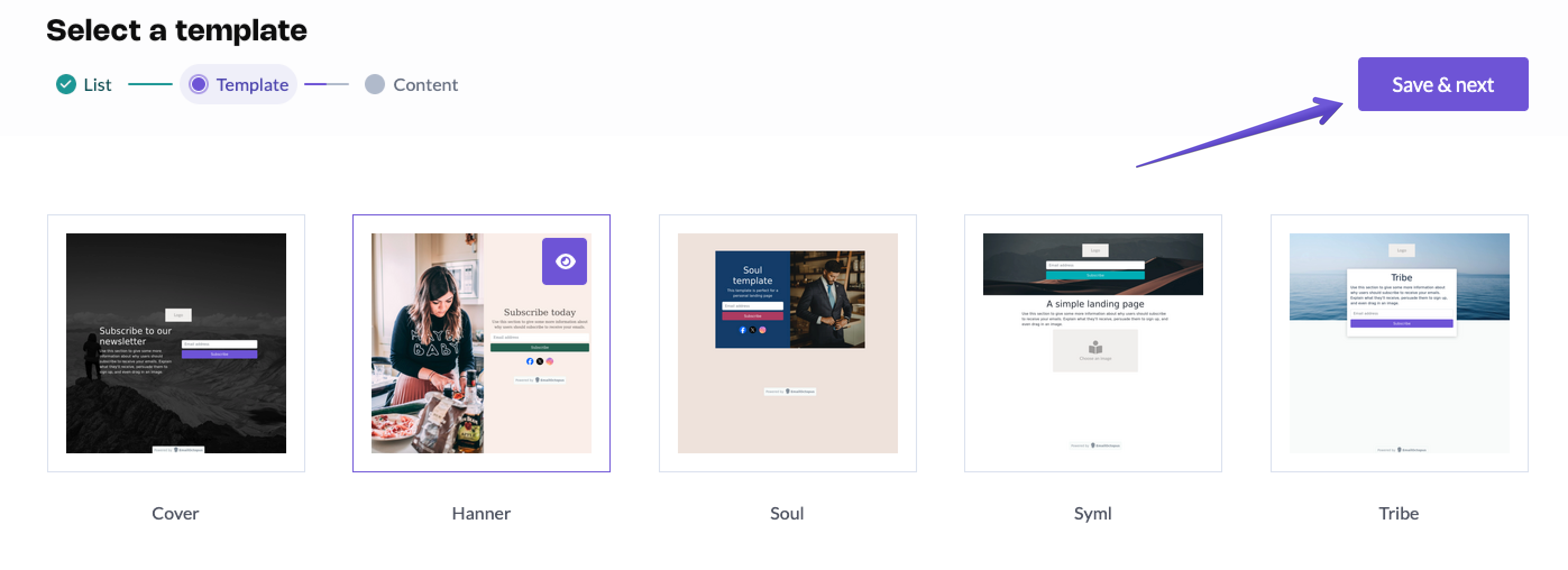 Choose one of the templates for your landing page and click the 'Save & next' button.