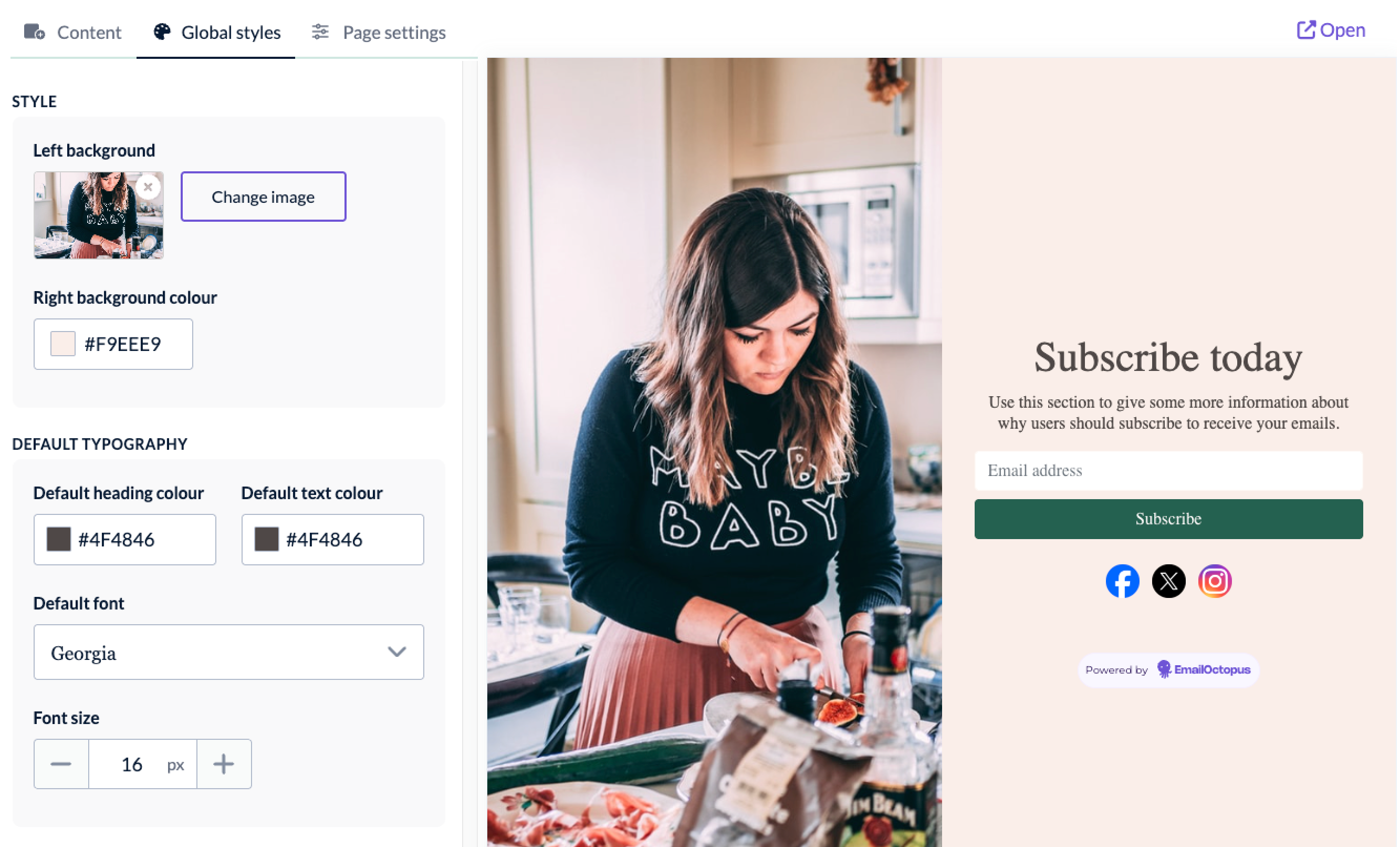 To design your landing page, you can drag and drop elements into the template and move them around. For example, you can change the image and background colour, as well as the default font settings in the Global styles tab.