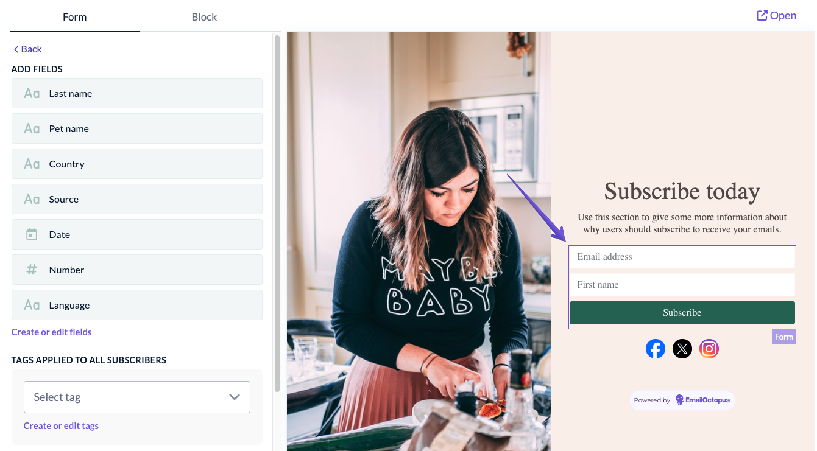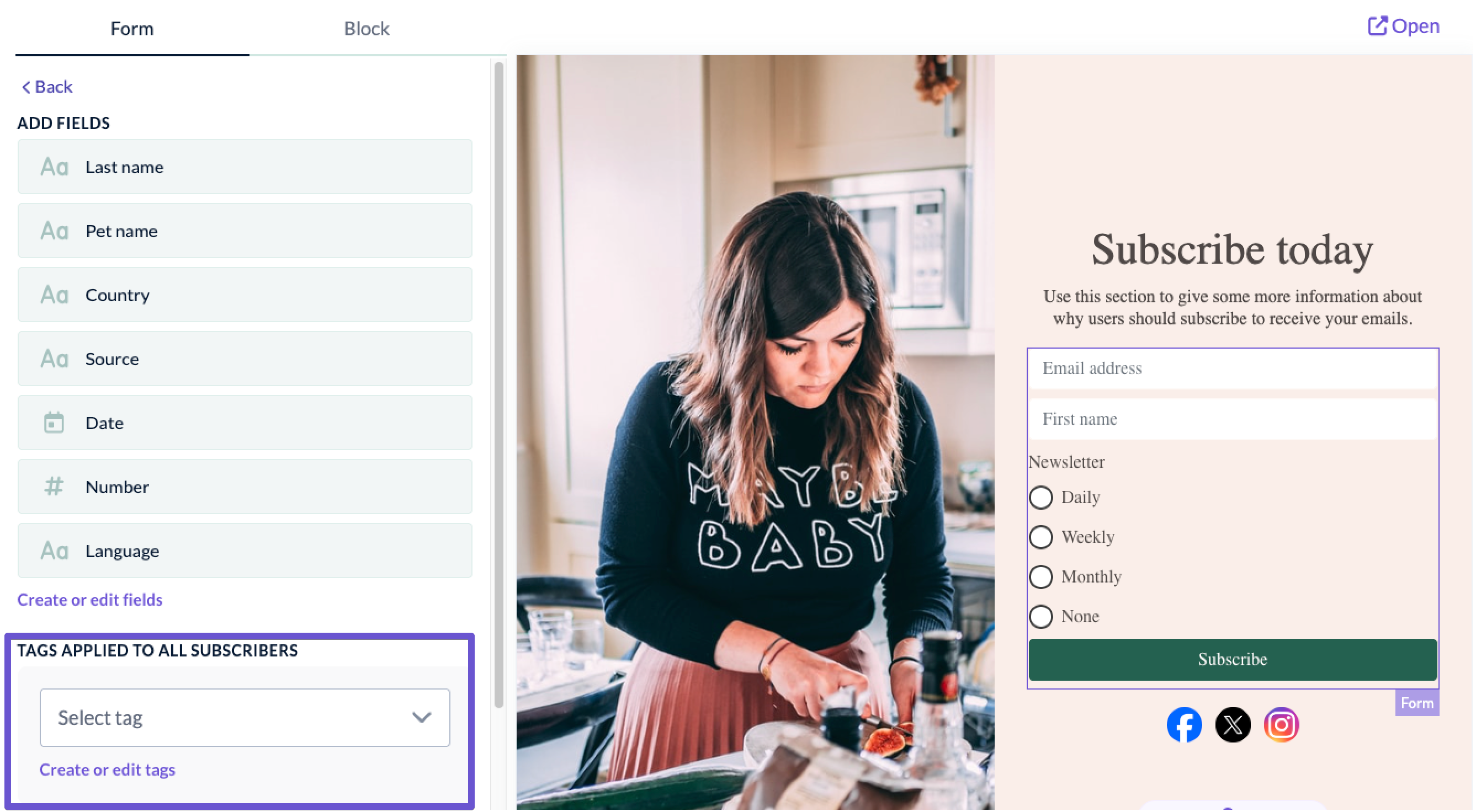 You can also choose to automatically add a tag to all contacts who subscribe through that landing page. Just click on the sign-up form to display the form options, click Add new tag and select the tag:
