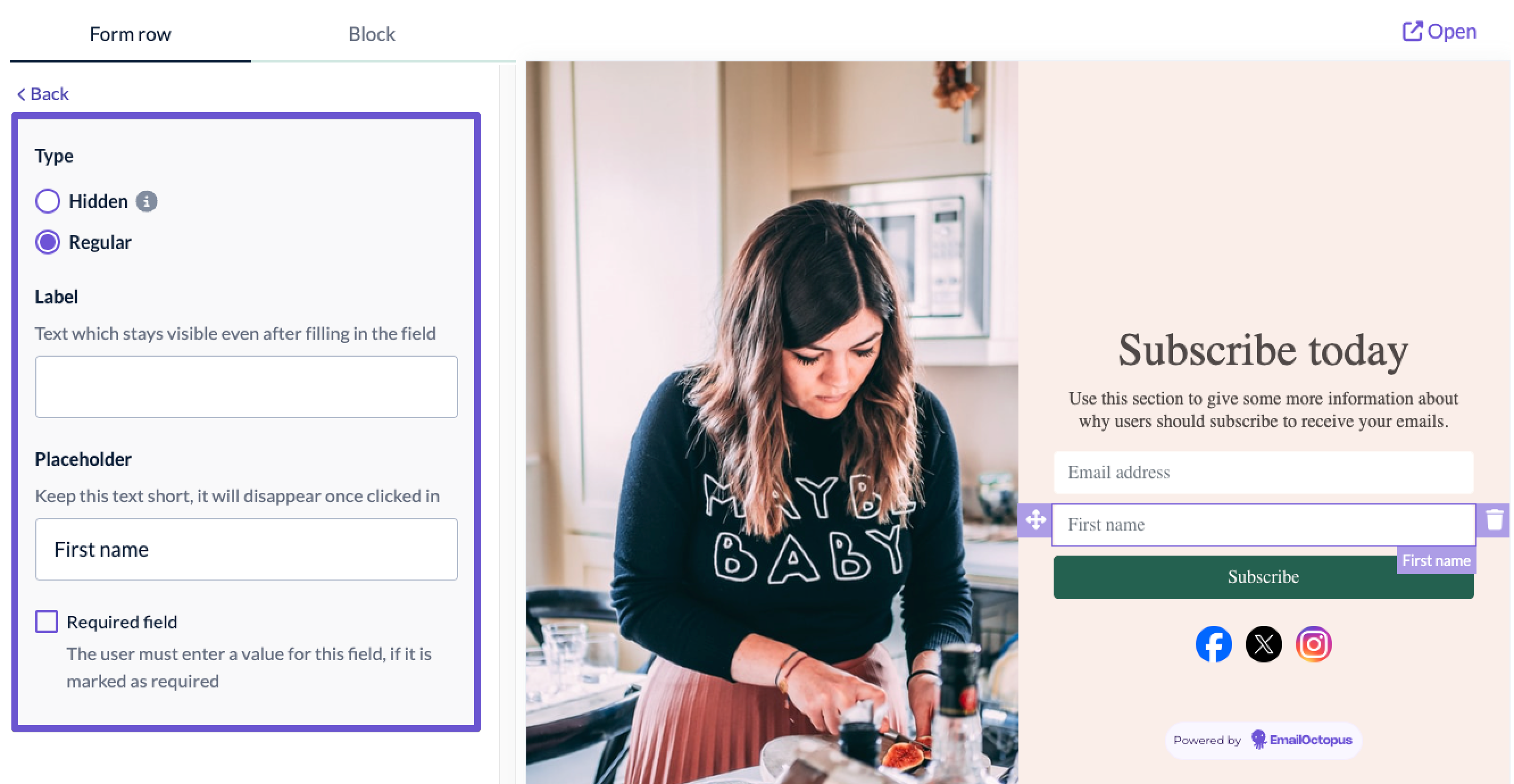 There, you can also decide whether the field will be regular or hidden (hidden fields allow you to segment your subscribers without them having to submit that data – for example, everybody signing up through a form published on your landing page could have a field "from landing page" assigned to them).