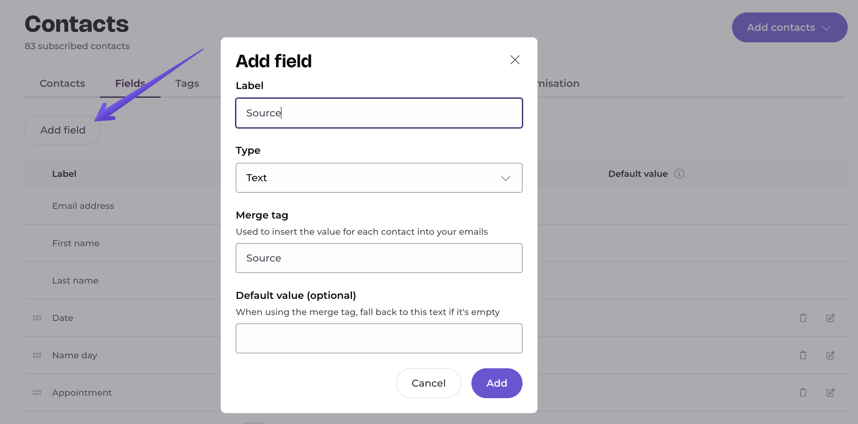 First, you have to add a new field that you'll use for tracking. In our example, we'll call it "Source".