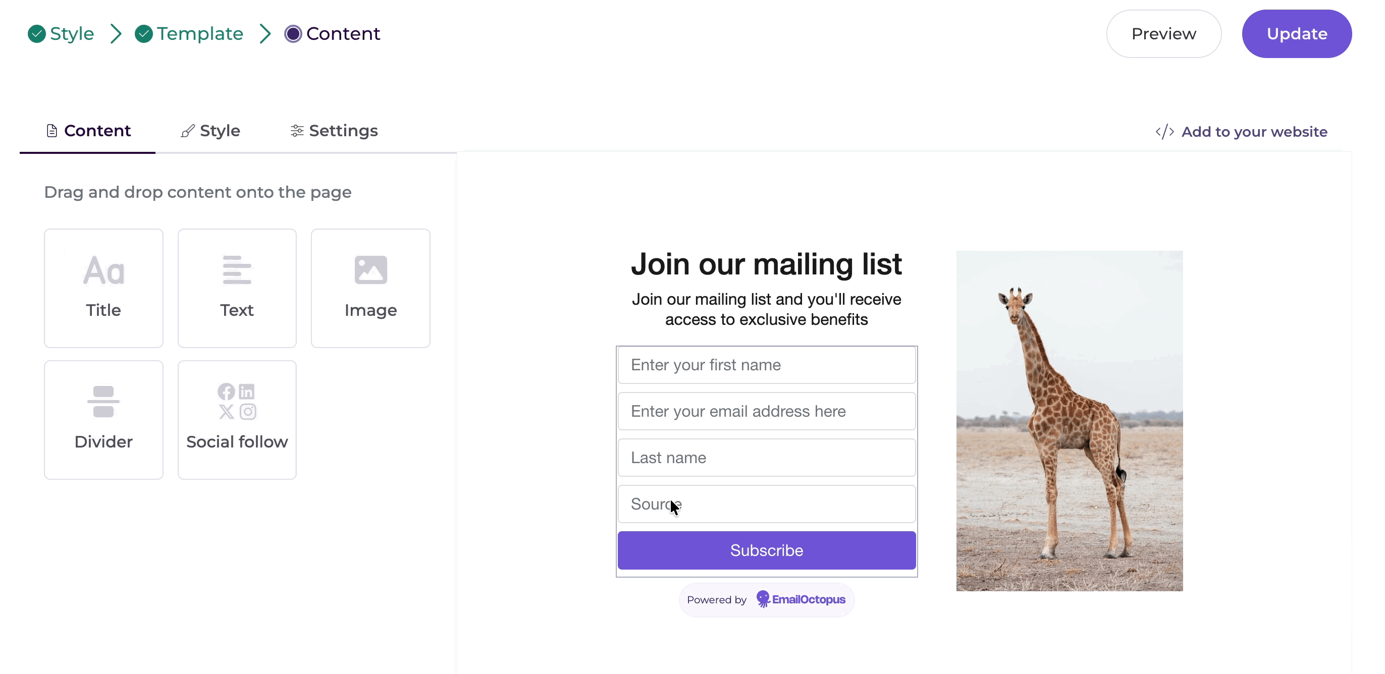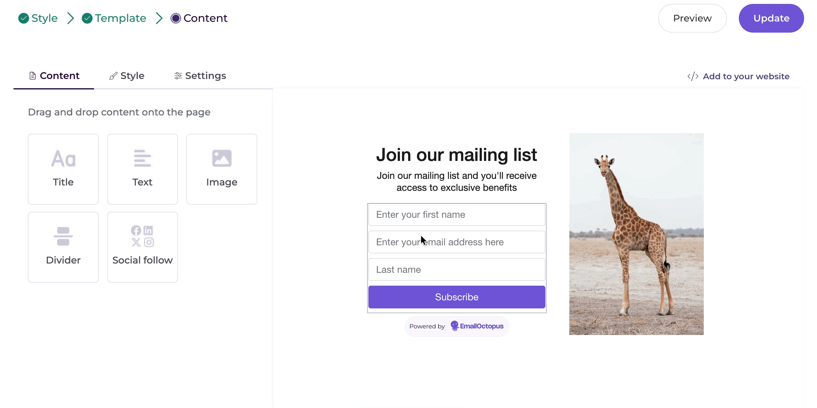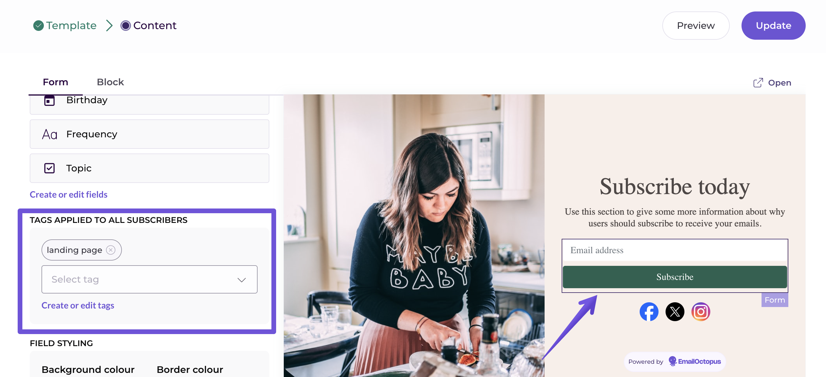 You can also add tags to assign them automatically to the contacts that subscribe through the form or landing page. To do that, click on Add new tag and select the appropriate tags from the dropdown menu.