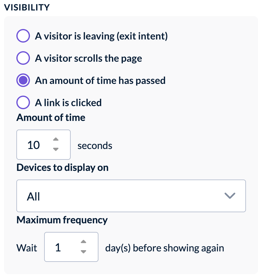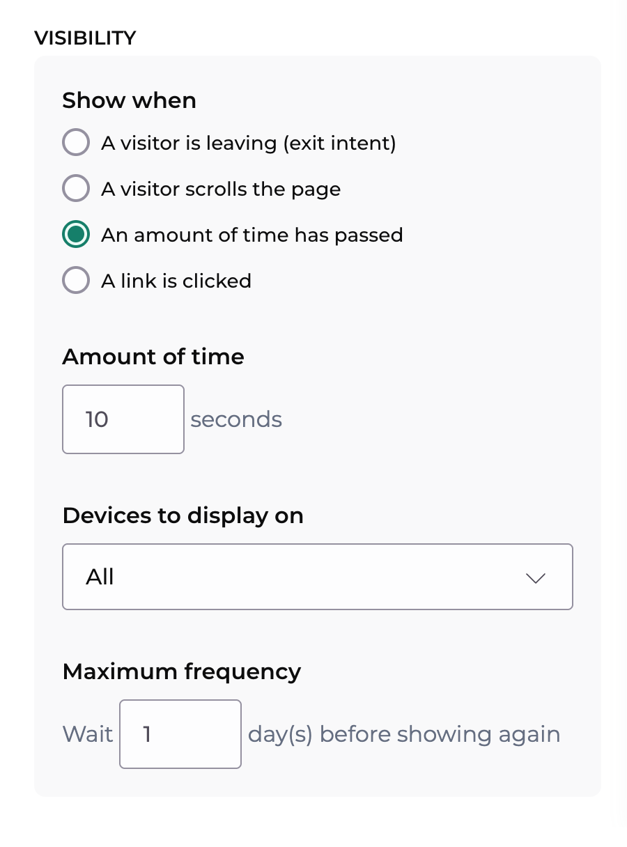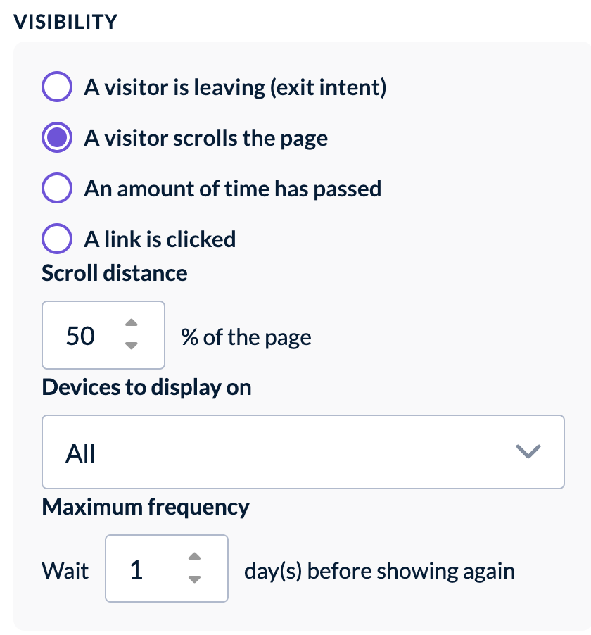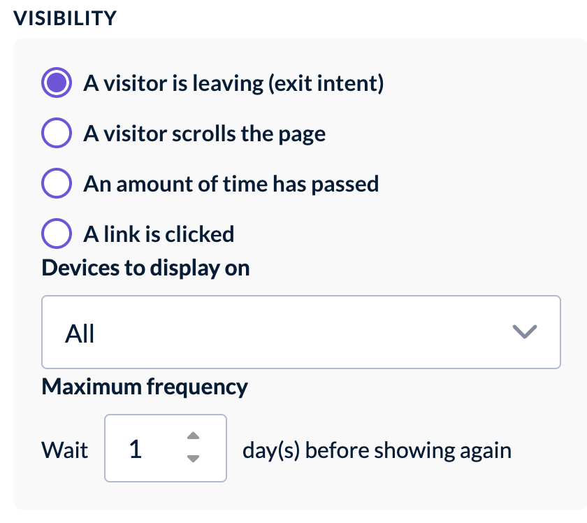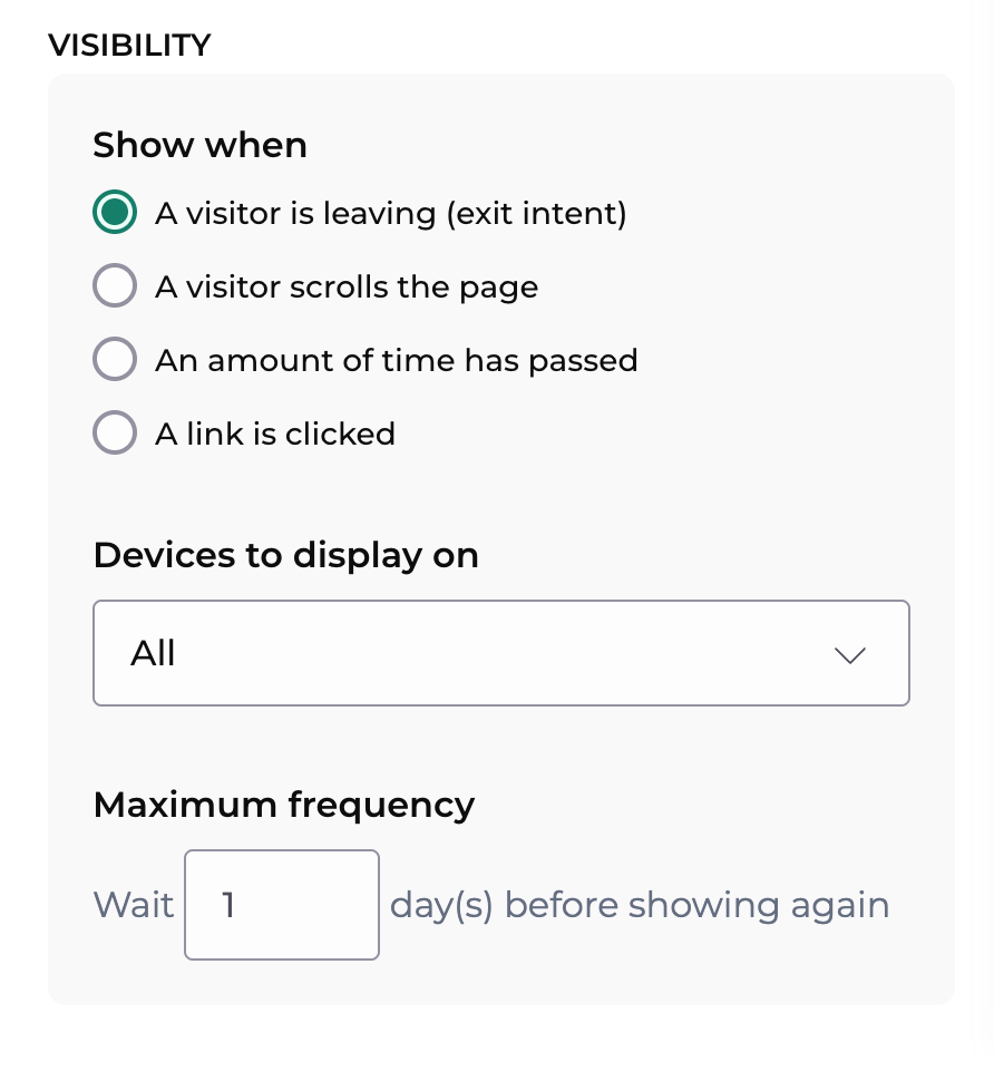 Using Visibility options you can choose on which devices to display your form, and how often your visitors should see it.