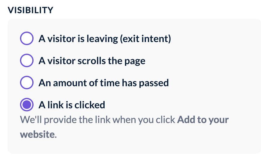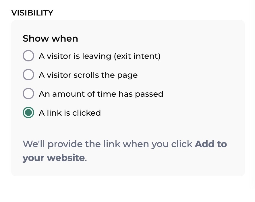 - Exit intent: the form will display when visitors attempt to exit the page