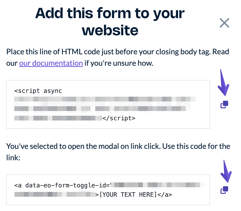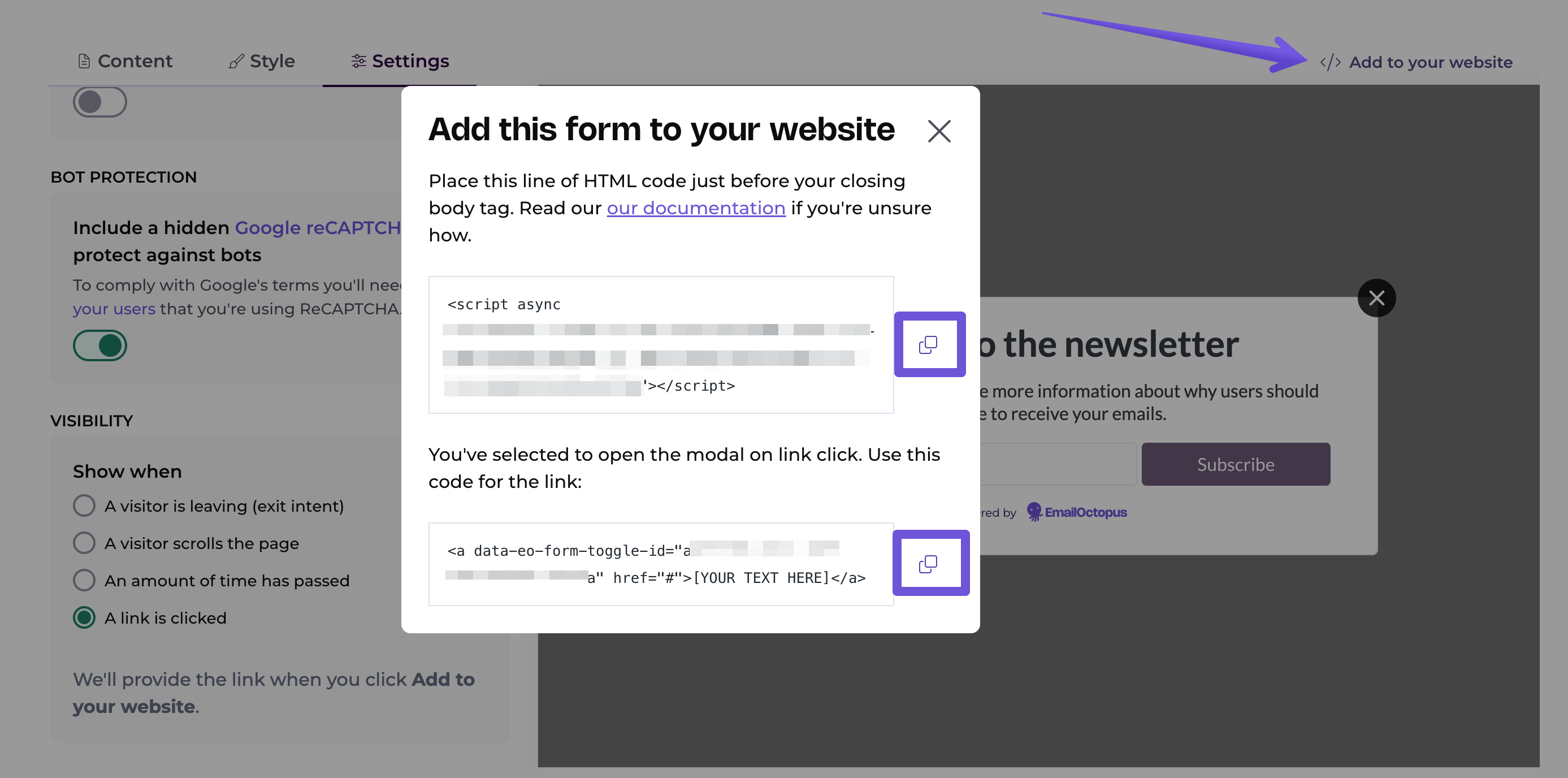 EmailOctopus form editor allows you to create pop-up subscription forms. You can trigger them based on timing, scroll percentage of your website, exit intent, or a button click.