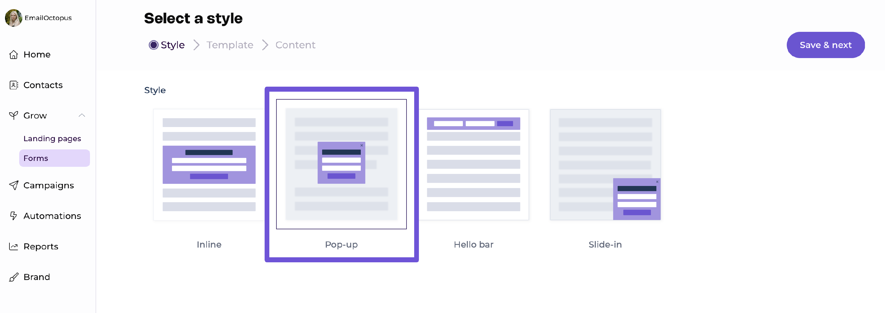 To create a pop-up form, click on the Grow tab from the sidebar and select Forms. Next, create a form and select the "Pop-up" form style.