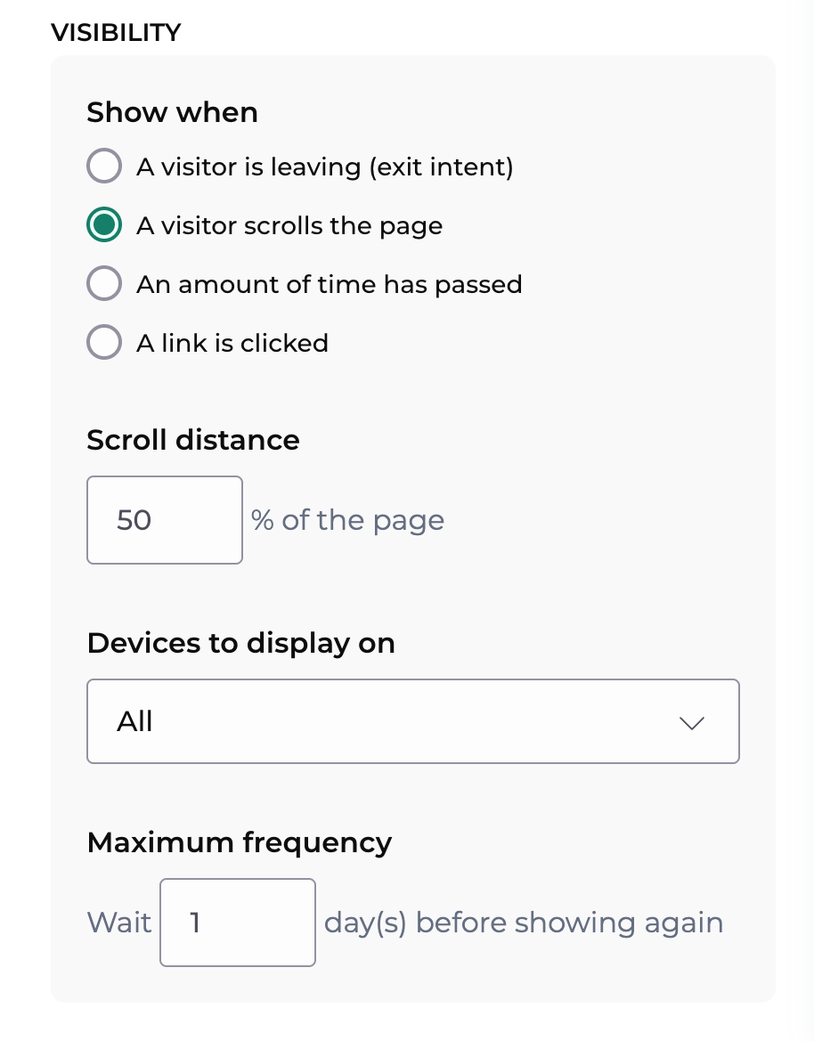 Scroll percentage: the form will display when visitors scroll down through a selected portion of your page