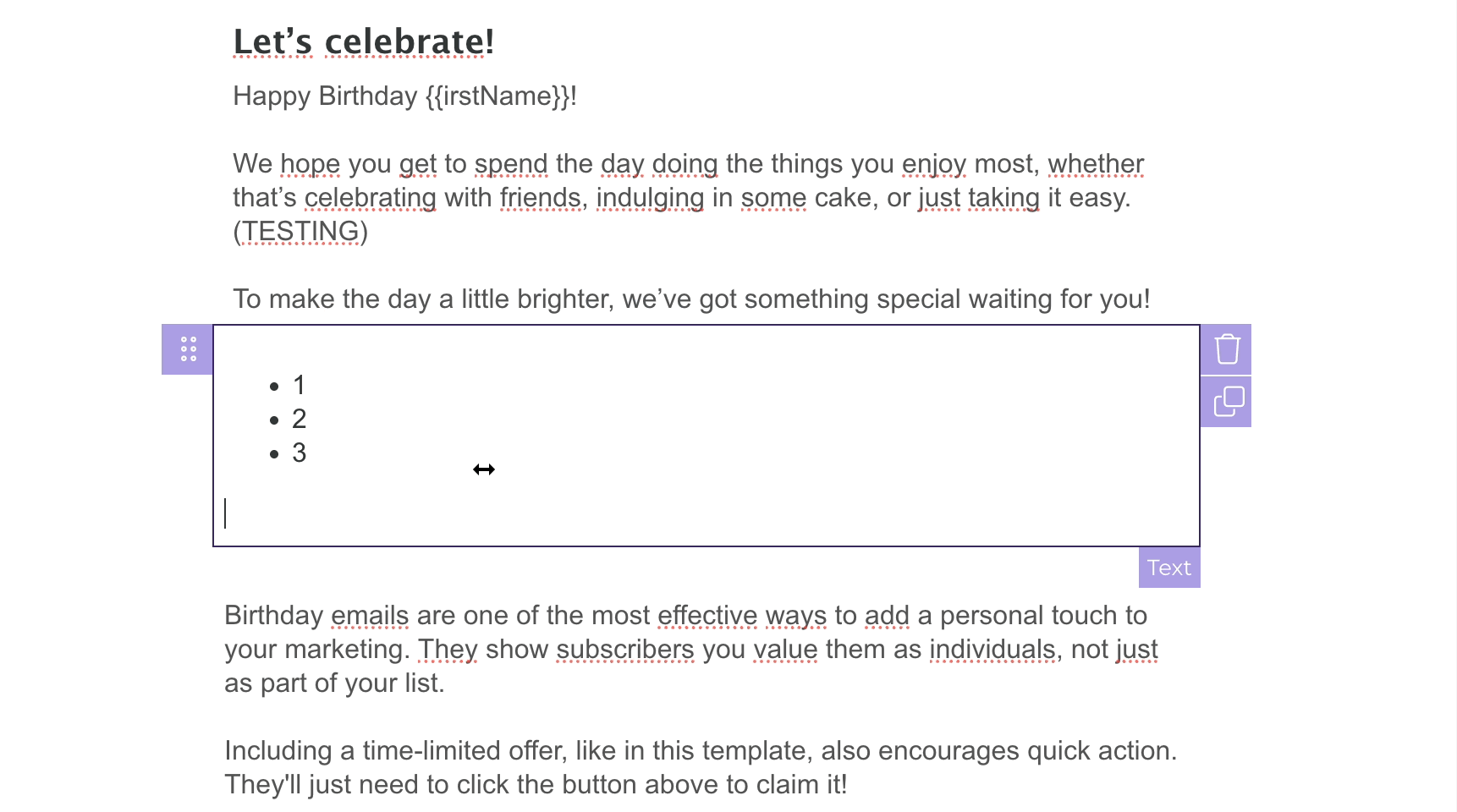 How to change the colour of the bullet points In drag and drop editor, you can change the colour of bullet points in your campaigns by selecting the list and using our text toolbar: