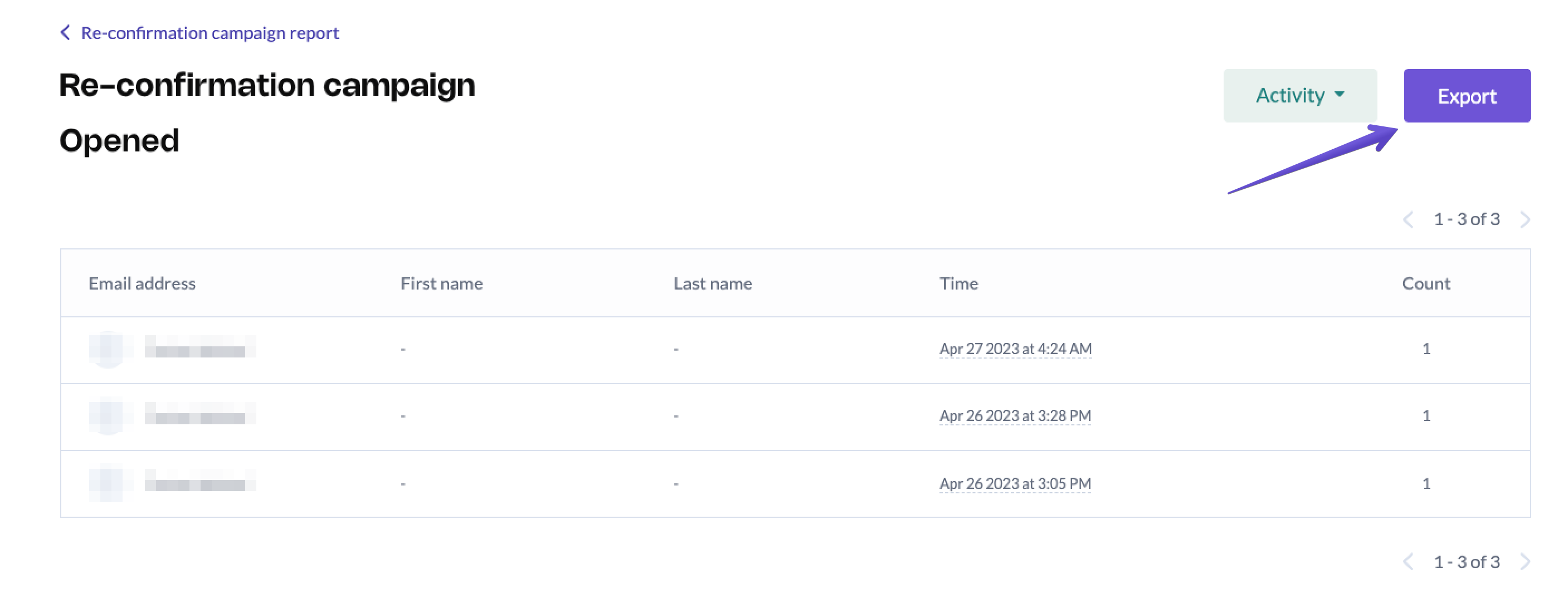 Count: each number in this column indicates how many times a contact has interacted with your campaign. Since this is an "opened" report, it shows the total number of times a contact opened your campaign.