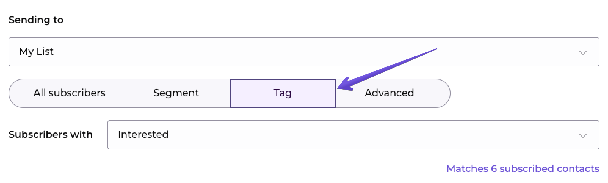 It’s possible to send a campaign to your subscribers with a specific tag. To do this, create a campaign, and in the "Sending to" section, click on the "Tag" tab and choose the specific tag from the drop-down.