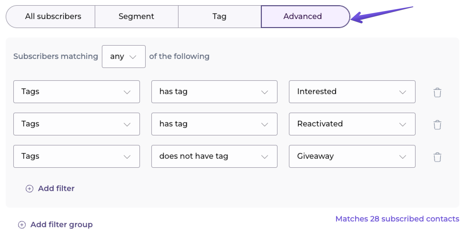 If you'd like to include – or exclude – people with a combination of different tags, you can do that in the "Advanced" tab by choosing conditions from the "Tags" category. If you want to add an extra condition, click on the "Add filter" button below the conditions.