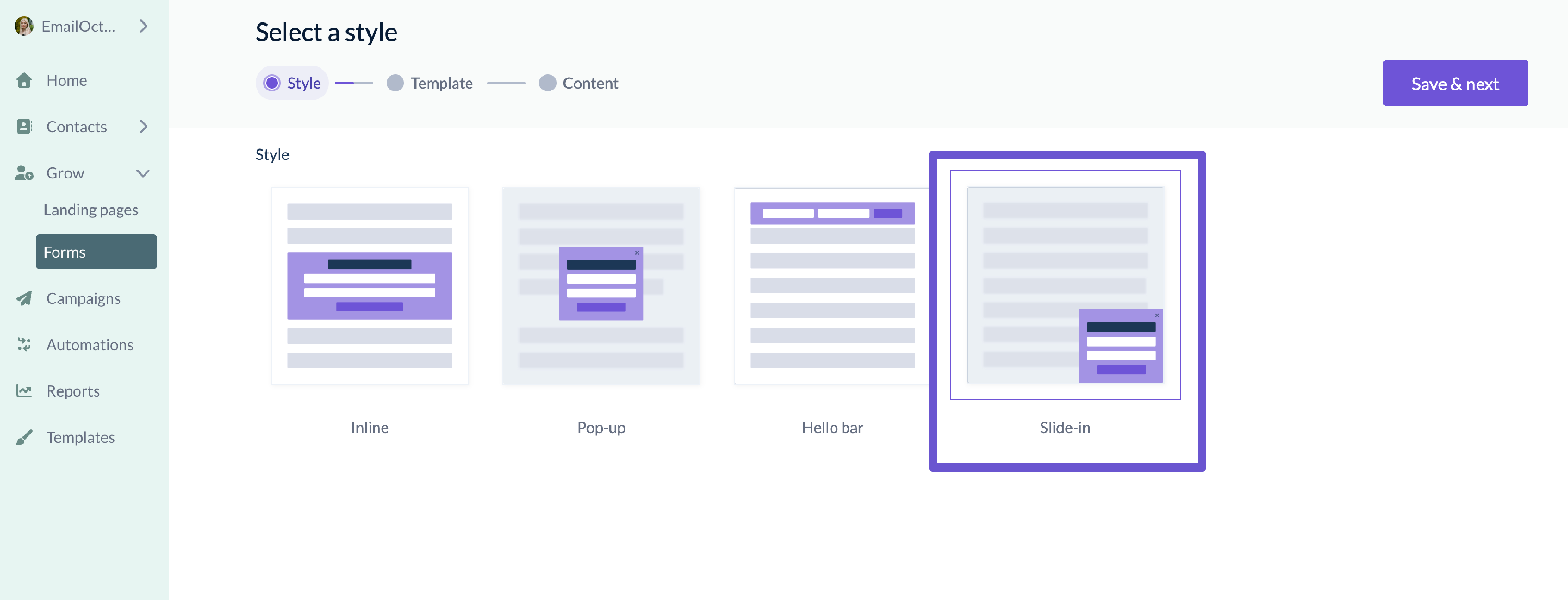 To create a slide-in form, click on the Grow tab from the sidebar and choose Forms. Next, create a form and select the "Slide-in" form style.