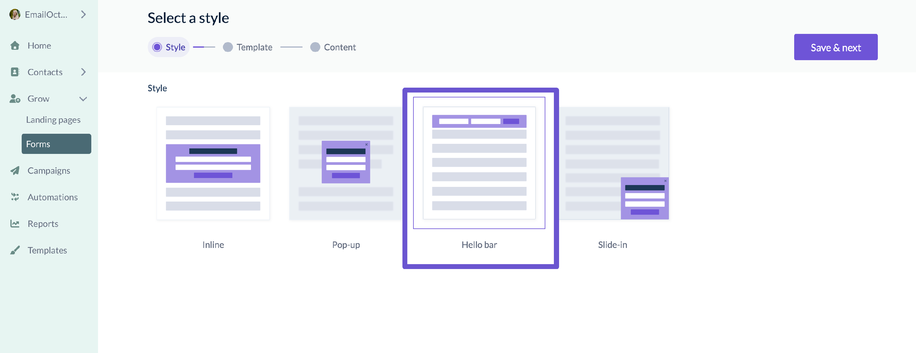 To create a slide-in form, click on the Grow tab from the sidebar and choose Forms. Next, create a form and select the "Hello bar" form style.