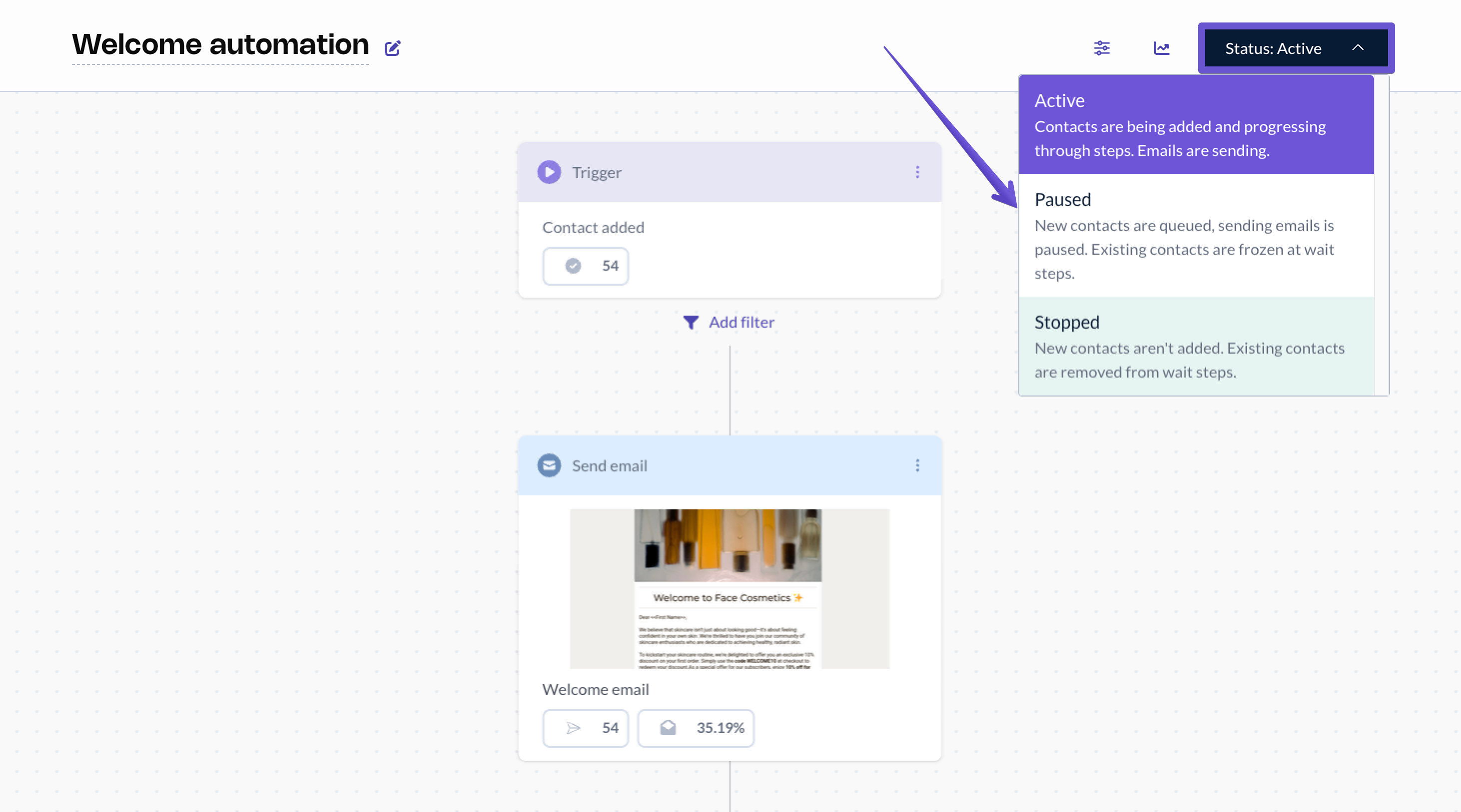 Once you pause an active automation, no emails will be sent to contacts going through the automation or queued to start it. New contacts added to the connected list will be added to the automation itself. And once you re-enable the automation, the contacts added while it was paused will start going through its steps.