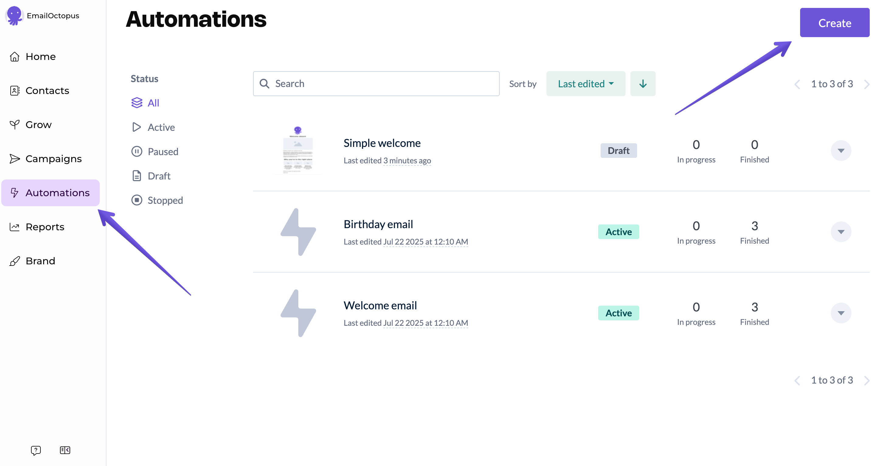 From the main dashboard, go to the Automations tab and click on the "Create" button.