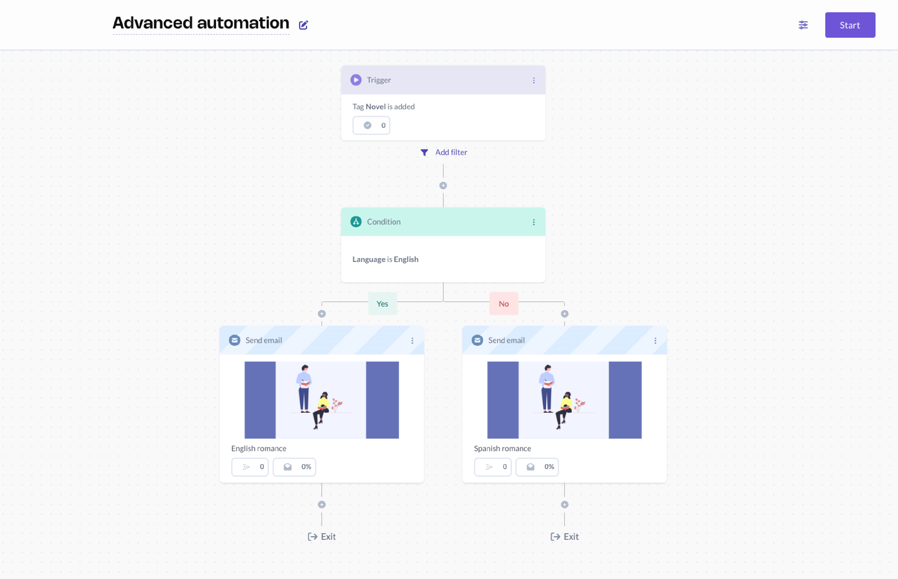 Now, you can add "Send email" steps on both sides to create emails in two languages for both groups. If you want to send more automated emails every few days, you can add "Wait" steps between them.