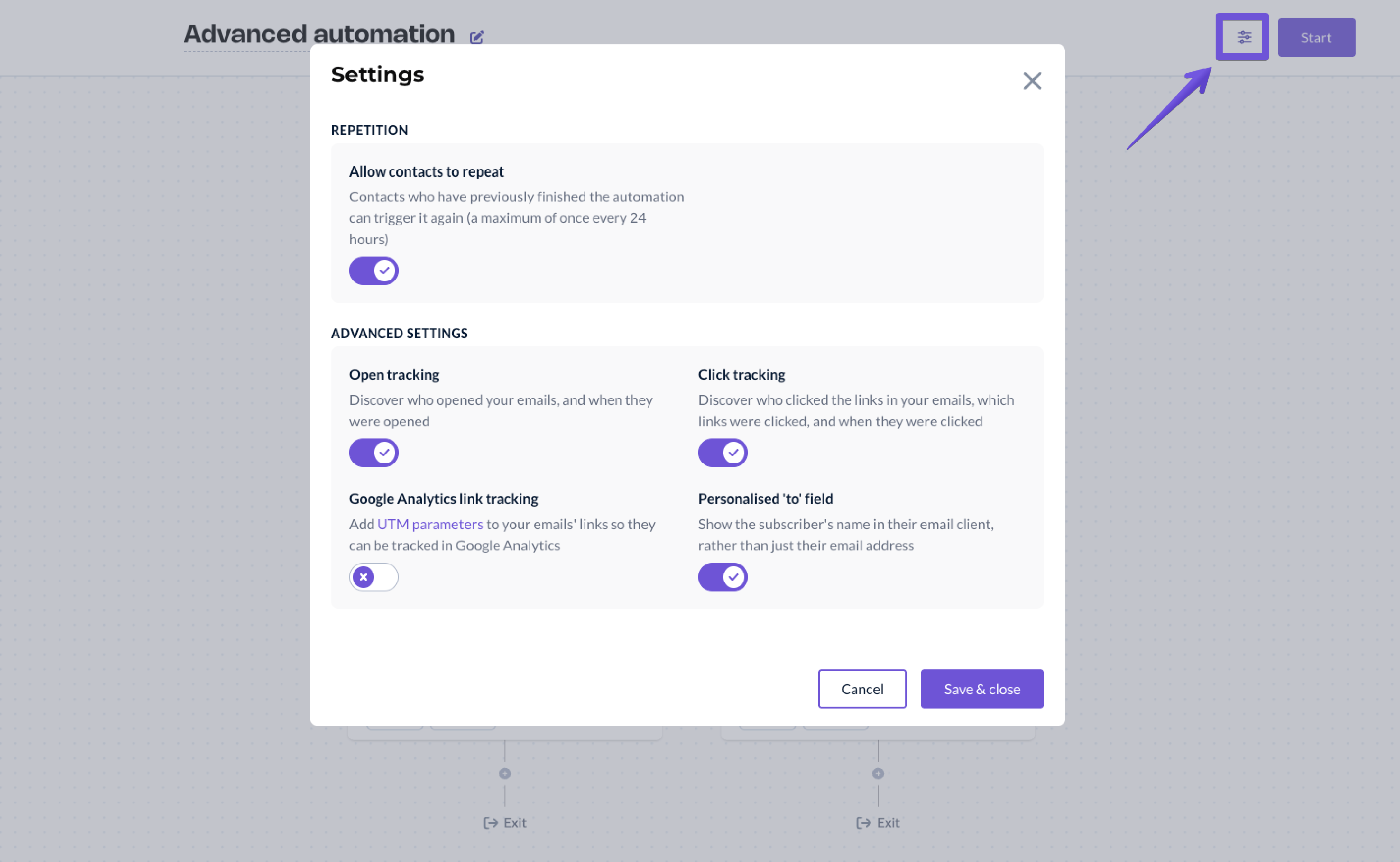 When you're done with your automation steps, click on the "Settings" button to enable the options you need, and click "Save & Close" if you made any changes.