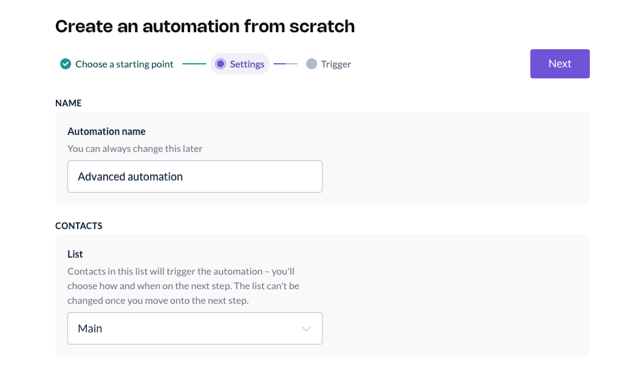 This will take you to the "Choose a starting point" screen. Let's select the "Start from scratch" option and you'll see a "Setup" screen, where you'll need to choose the name for your Automation and a list it will be connected to.