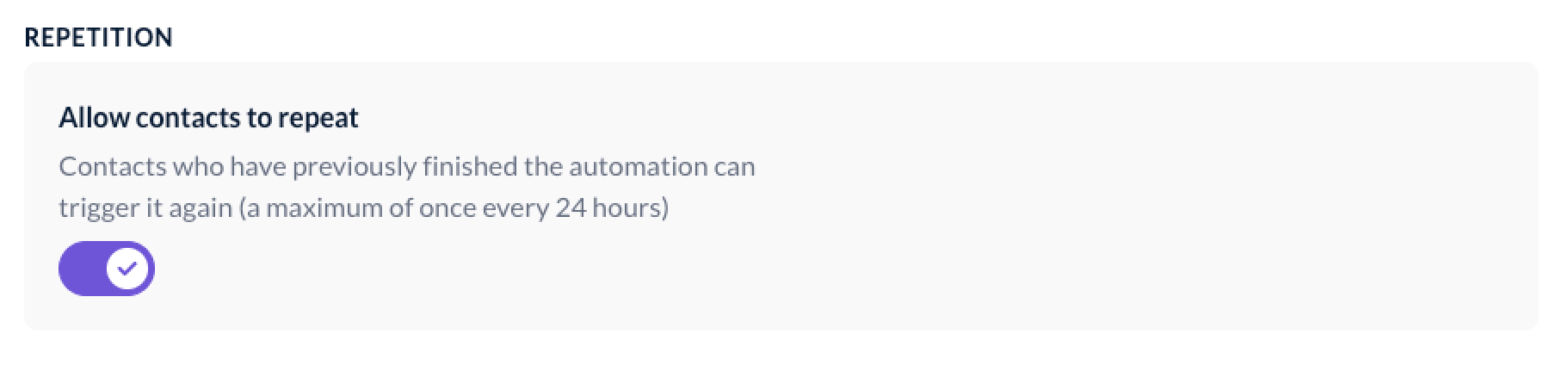 Below, you can decide whether to allow contacts to repeat the automation. If you enable this option, a subscriber who has already completed the automation will be able to trigger it again, provided that they match the trigger. You can learn more about this option here: Repeating an automation.
