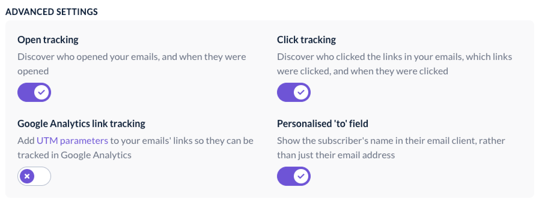 Finally, you can select some additional settings related to email tracking. We recommend keeping the Open and Click tracking enabled to get an idea of your emails' performance.