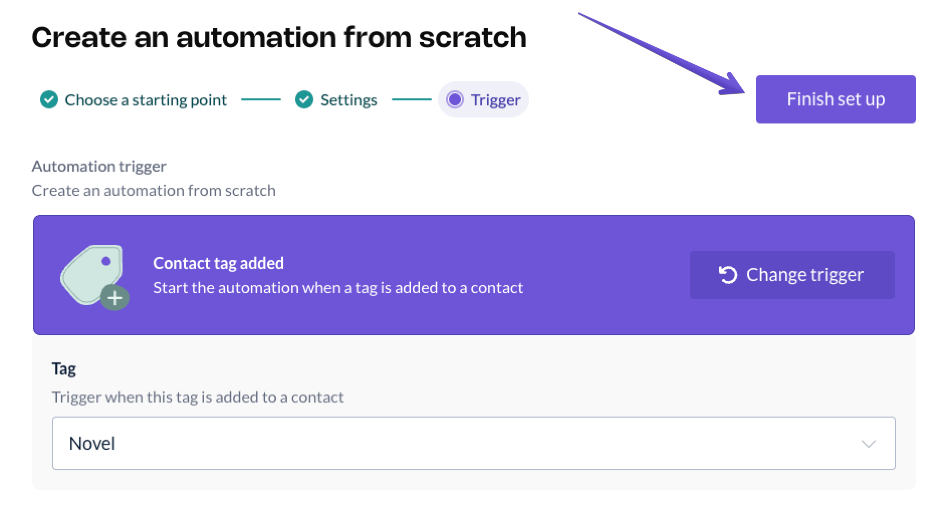 You will see a page prompting you to choose your automation trigger, determining which of your subscribers from the connected list will be included in your automation. The trigger that you'd choose would depend on your specific marketing scenario. Select your trigger and click "Finish setup".