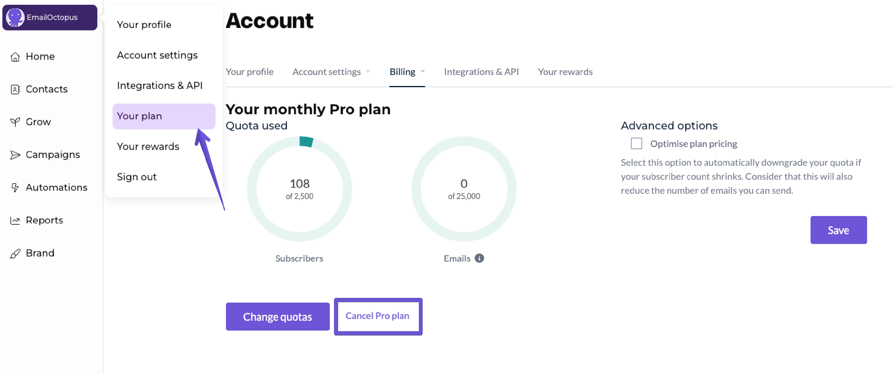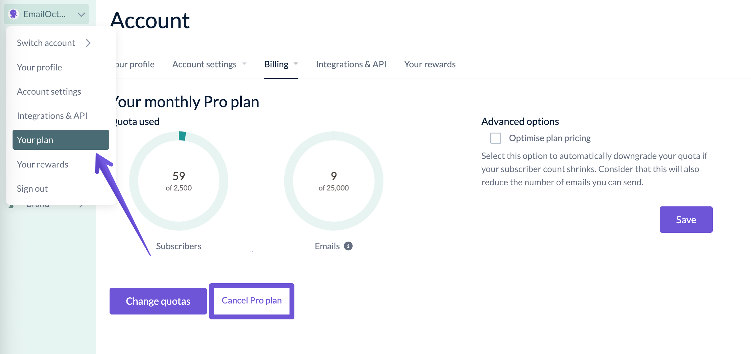 You can cancel your EmailOctopus Pro plan at any time. You can do that in the Billing section of your account by clicking on the purple "Cancel Pro plan" link.