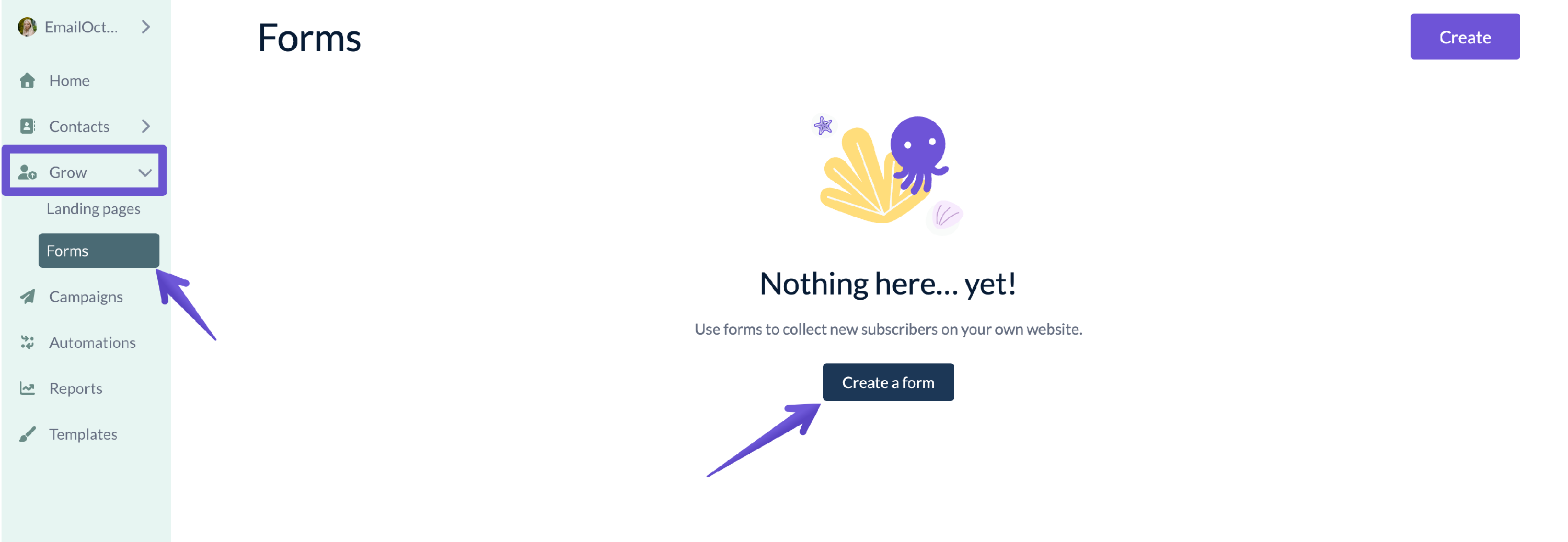 You can create one by clicking on the Grow tab from the sidebar and selecting Forms. Then, click Create or Create a form.