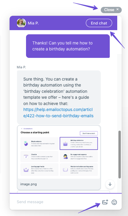 Sometimes, to be able to troubleshoot your issue better, we might ask you for a screenshot of the issue – just click on the image icon next to your text field to attach your image.