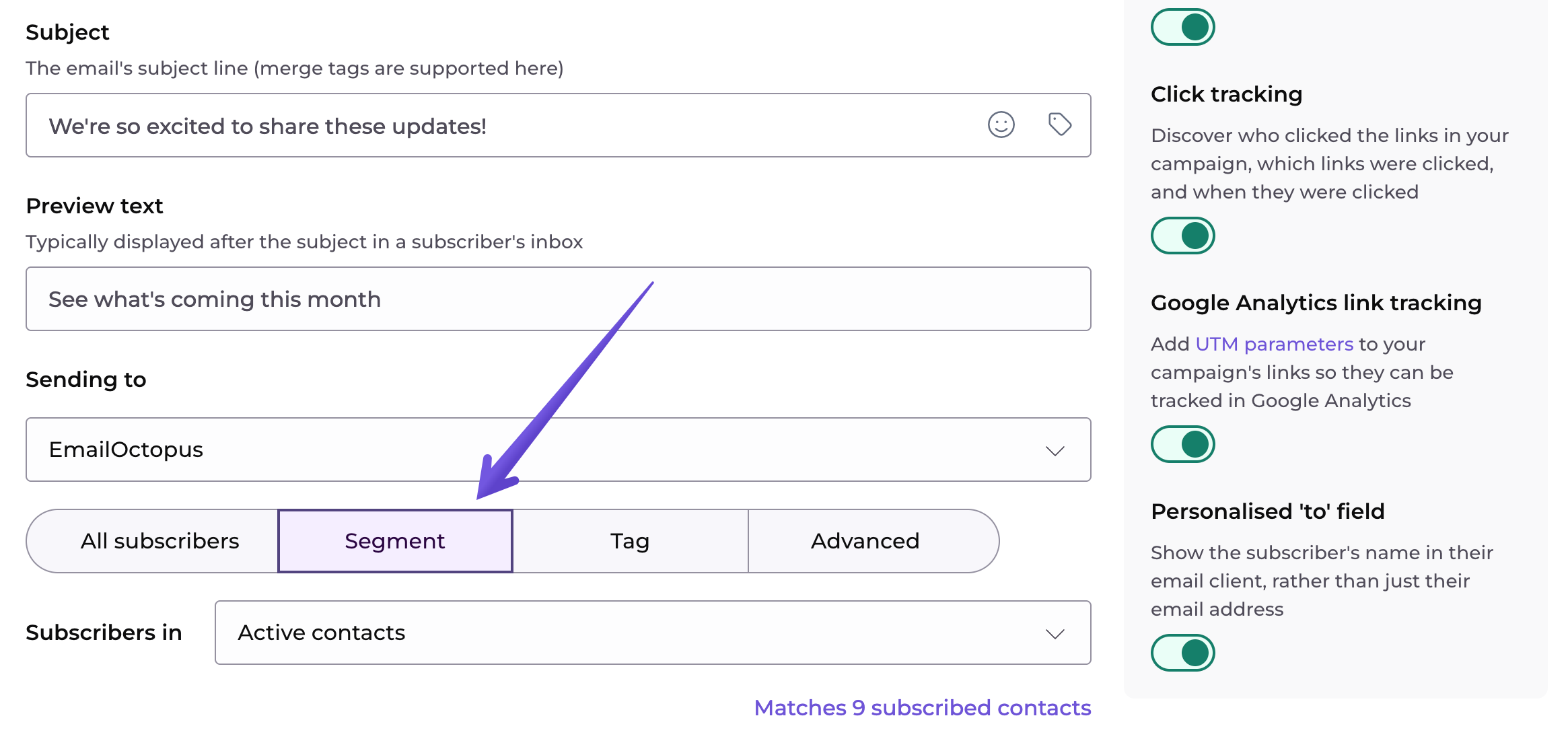 When creating a campaign, you can send it to a segment of your list you created earlier. To do that, simply click on the "Segment" tab in the "Sending to" field: