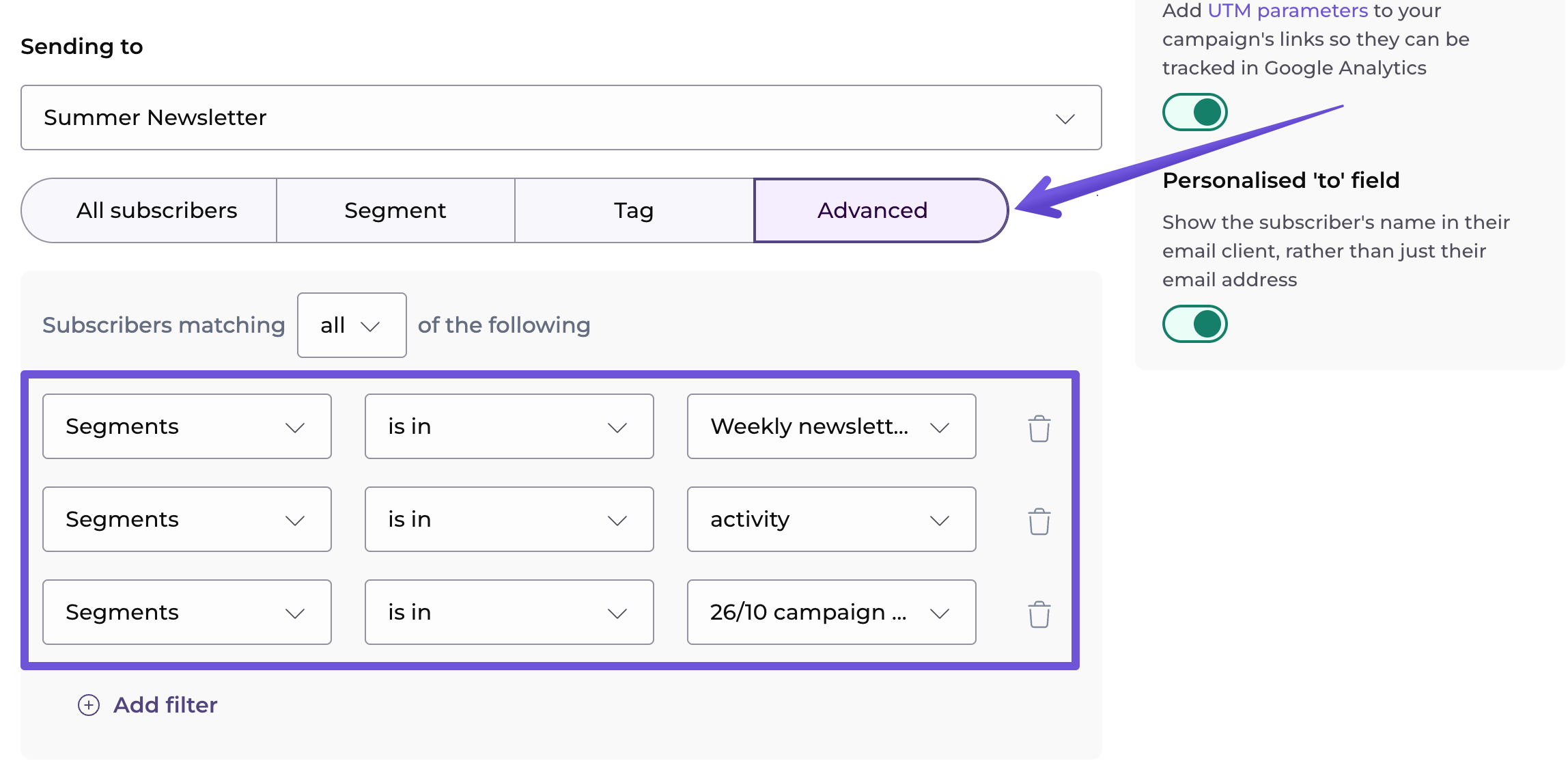 If you want to include or exclude multiple segments in a campaign, go to the “Advanced” tab, choose "Segments" from the first condition field, and then choose a specific condition modifier and segment.