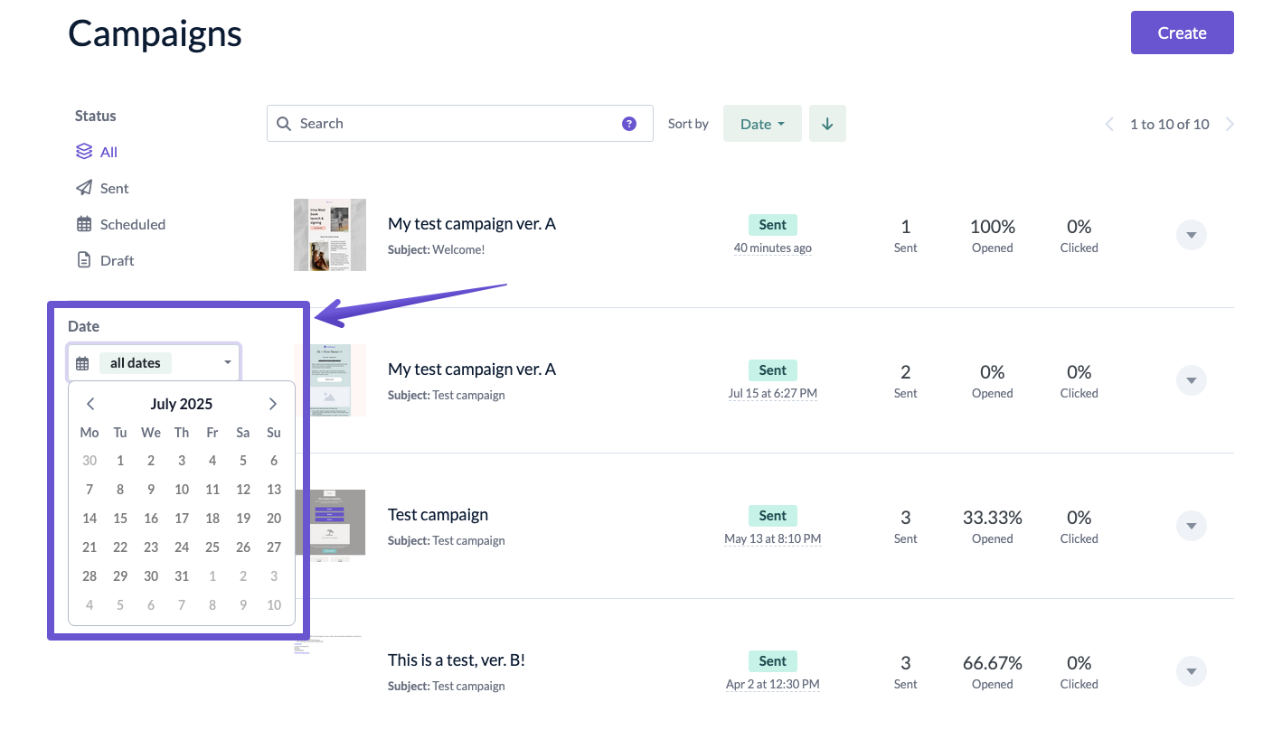 Below the Status section, you'll also see the Date option. Here, you can set a specific timeframe or pick a particular day the campaigns were created, scheduled for and/or sent. Click on the drop-down to view the calendar and pick your desired timeframe or day.