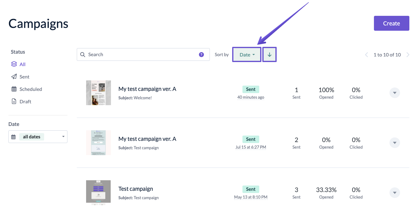 You can sort your campaigns by name, date, click/open rates or the number of contacts the campaign was sent to. Just click on the button in the Sort by section and choose the appropriate option. You can also click the arrow icon to choose the ascending or descending order.