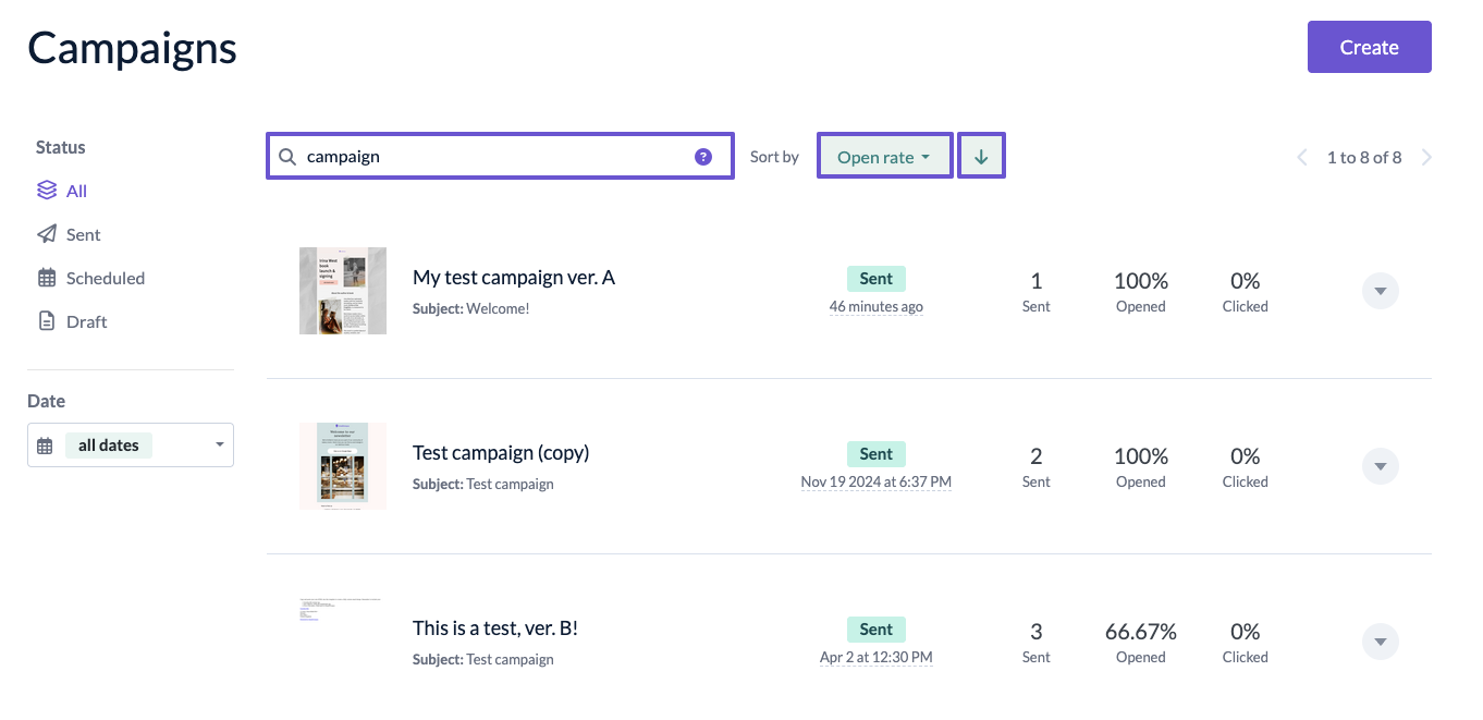 You can search for a specific campaign by typing the campaign name or subject line in the search bar. You can also adjust the results' order by using the sorting options. The matching campaigns will be displayed automatically below.