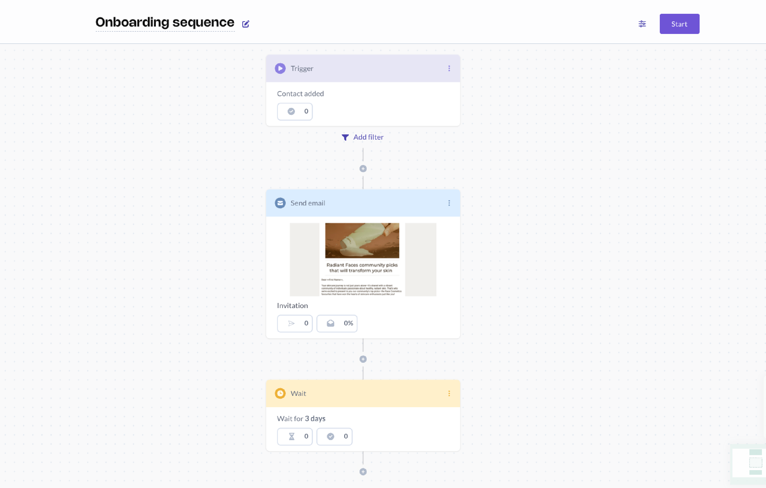As soon as a contact is added to our list, you can send them an email, followed by a wait step to allow people to interact with the initial email.
