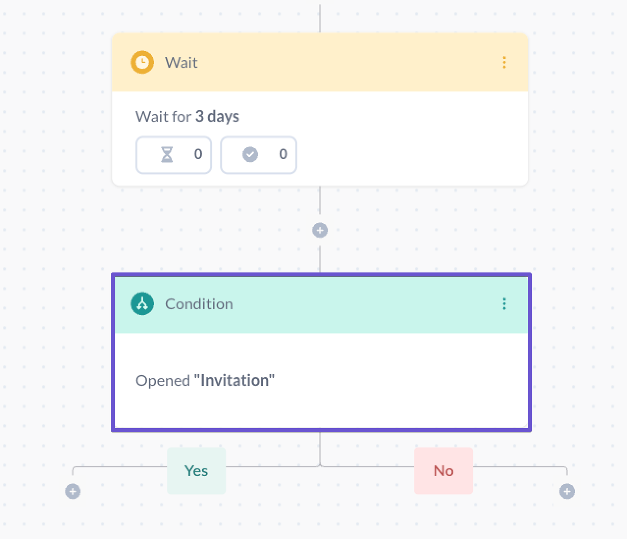 Then, you can add a condition step and choose “Automated email activity > opened > Invitation” to check if they opened the first email.